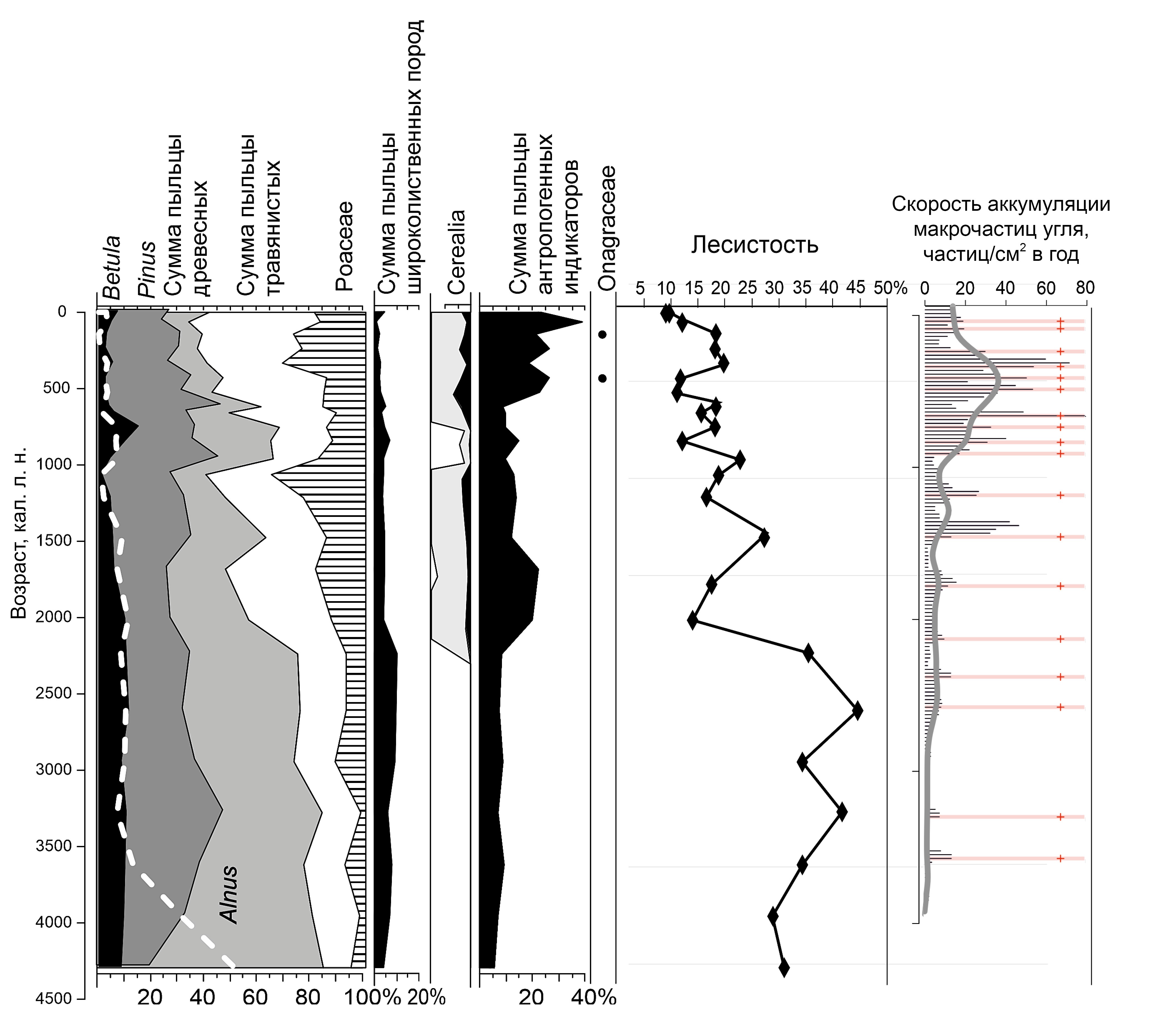 Существенные изменения растительного покрова в районе Куликова поля произошли около 2300 кал. л. н. Доля пыльцы деревьев и кустарников сократилась с 80 до 50–60%, в то же время участие трав и пыльцы растений – антропогенных индикаторов увеличилось (Novenko and Volkova, 2015), постоянным компонентом спорово-пыльцевых спектров стала пыльца культурных злаков (см. рис. 5). Лесистость территории понизилась до 15% (Новенко, 2017). В разрезах поймы Непрядвы выявлены признаки антропогенной эрозии почв (Сычева, 2009). Однако, анализ концентрации макроскопических частиц угля в торфе не выявил возрастания пожарной активности в районе исследований. Подъем кривой скорости аккумуляции угля и сокращение МПИ происходит только около 1500 кал. л. н. Возможно, обезлесение территории было связано с антропогенным фактором, например, с рубкой деревьев и использованием древесины. Археологические свидетельства пребывания человека на территории Куликова поля в эпоху бронзы фрагментарны. Возможно, в этот период на изучаемой территории существовали скотоводческие хозяйства (Гоняный и др., 2007). Но большинство исследователей указывает, что периоды освоения территории в бронзовом веке были кратковременными и оказывали локальное воздействие на окружающую среду (Гоняный и др., 2007; Фоломеев и др., 1990; Хотинский, 1988; Хотинский и др., 1979). Археологические памятники раннего железного века в районе Куликова поля не обнаружены. Возможно, изменения растительности, выявленные по спорово-пыльцевым спектрам, и появление пыльцы культурных злаков отражают некоторый региональный фон, при этом на участке, непосредственно примыкающем к Подкосьмовскому болоту, поселения человека могли отсутствовать.
