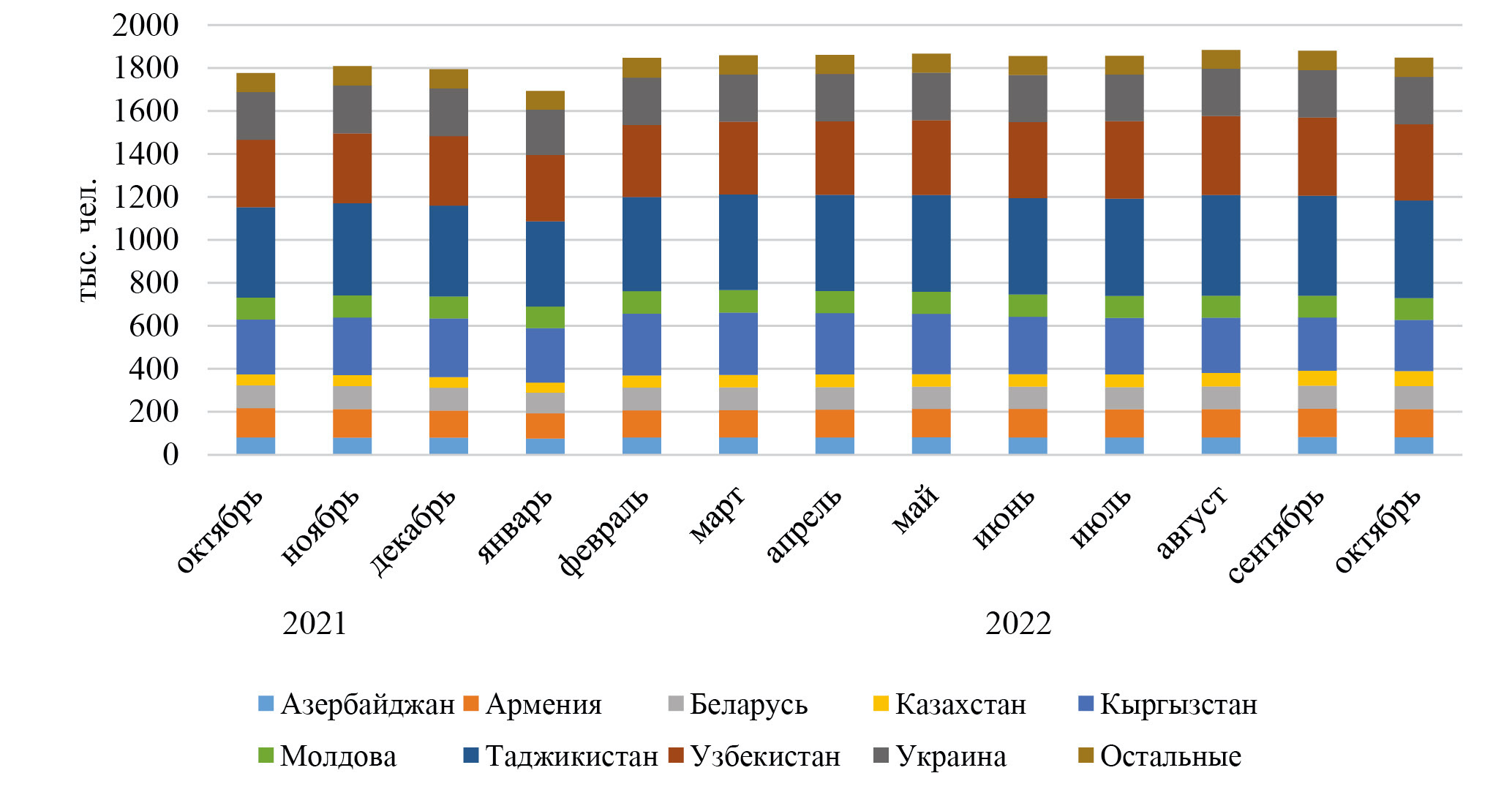 Московская агломерация как крупнейший центр притяжения мигрантов из постсоветских стран концентрирует на своей территории 1.8 млн иностранных мигрантов (9% от всего населения), численность которых была практически стабильна на протяжении октября 2021 – октября 2022 г. При этом наиболее заметное влияние на ее динамику оказали новогодние праздники, а не специальная военная операция и последовавшие события. Стабильной оставалась и география стран выхода мигрантов: почти 2/3 из них представлены тремя среднеазиатскими странами (Таджикистан, Узбекистан, Кыргызстан) при доле мигрантов не из бывших союзных республик около 3%.