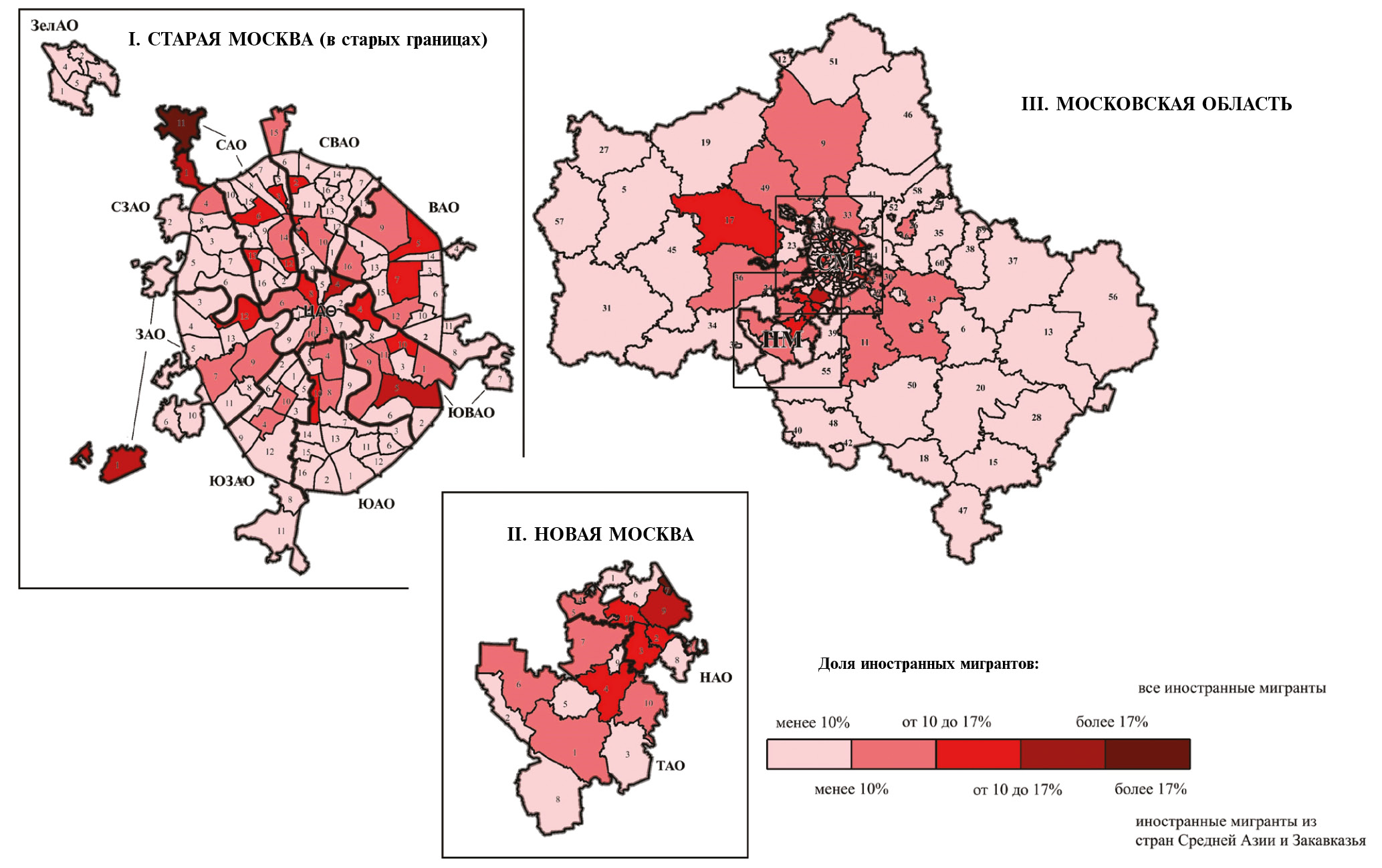 Принимая во внимание используемый в международной практике порог доли иностранцев в 17% как “точки кипения” (по М. Глэдвелу), после достижения которого резко увеличивается риск этнической пространственной сегрегации, на территории столичной агломерации были выделены два наиболее выраженных ареала повышенной концентрации иностранных мигрантов – юго-восточный, расположенный на стыке Москвы и области (ядро Люблино–Котельники), и новомосковский (ядро Мосрентген–Сосенское). Именно эти два полюса в значительной мере перетянули на себя деловую активность низкоквалифицированной иностранной рабочей силы после закрытия Черкизовского рынка и Покровской овощебазы, что в сочетании с невысокой стоимостью арендного жилья создает благоприятную среду для формирования здесь в перспективе этнических гетто.