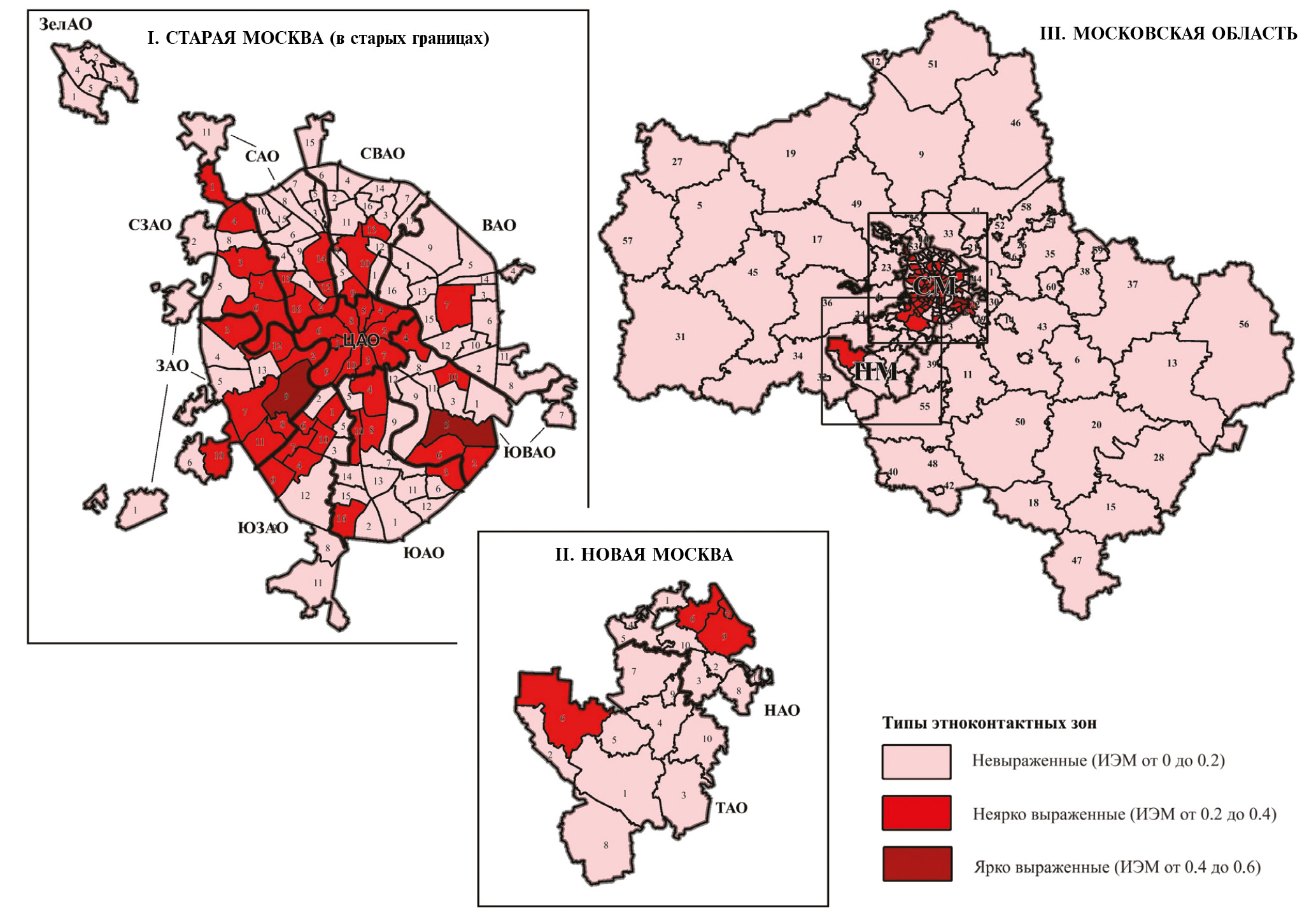 Рис. 3. Этноконтактные зоны Москвы и Московской области. Цифровые обозначения районов/поселений по административным округам Москвы и городских округов Московской области см. в подписи к рис. 2.