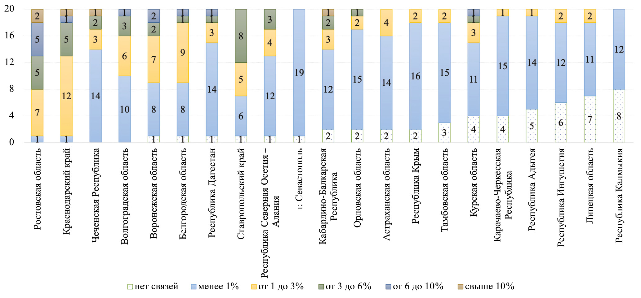 В наименьшей степени вовлеченными в широкую географию научного сотрудничества в 2017–2022 гг. оказались республики Адыгея, Ингушетия, Калмыкия и Липецкая область, у которых отсутствуют совместные публикации с пятью и более регионами Большого Юга России. Еще у пяти регионов (Астраханская и Тамбовская области, республики Крым и Карачаево-Черкесия, Севастополь) наряду с отмеченными выше субъектами РФ в структуре связей отсутствуют регионы с долей совместных публикаций выше 3% (рис. 2).