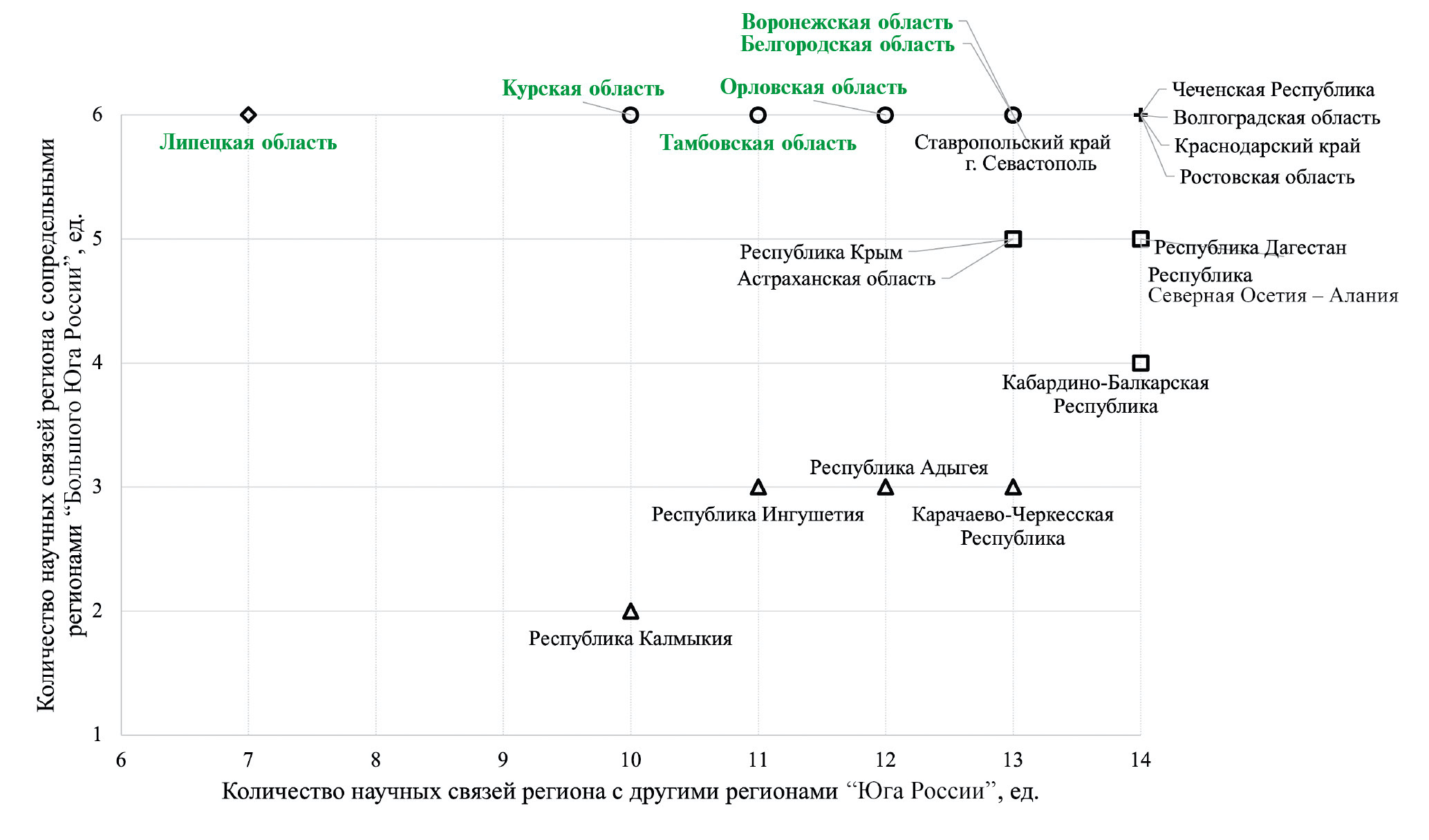Следует отметить наличие тесного научного сотрудничества между географически близкими регионами, такими как, например, Краснодарский край и Республика Адыгея; Республики Чечня, Ингушетия, Дагестан, Кабардино-Балкария. Они (за исключением Краснодарского края) не имеют высоких показателей публикационной активности, однако территориальная общность способствует установлению кооперационных связей. Географическая близость в качестве положительного фактора для научного сотрудничества может быть определена и для северных регионов Большого Юга России, центром тяготения которых служит Воронежская область.