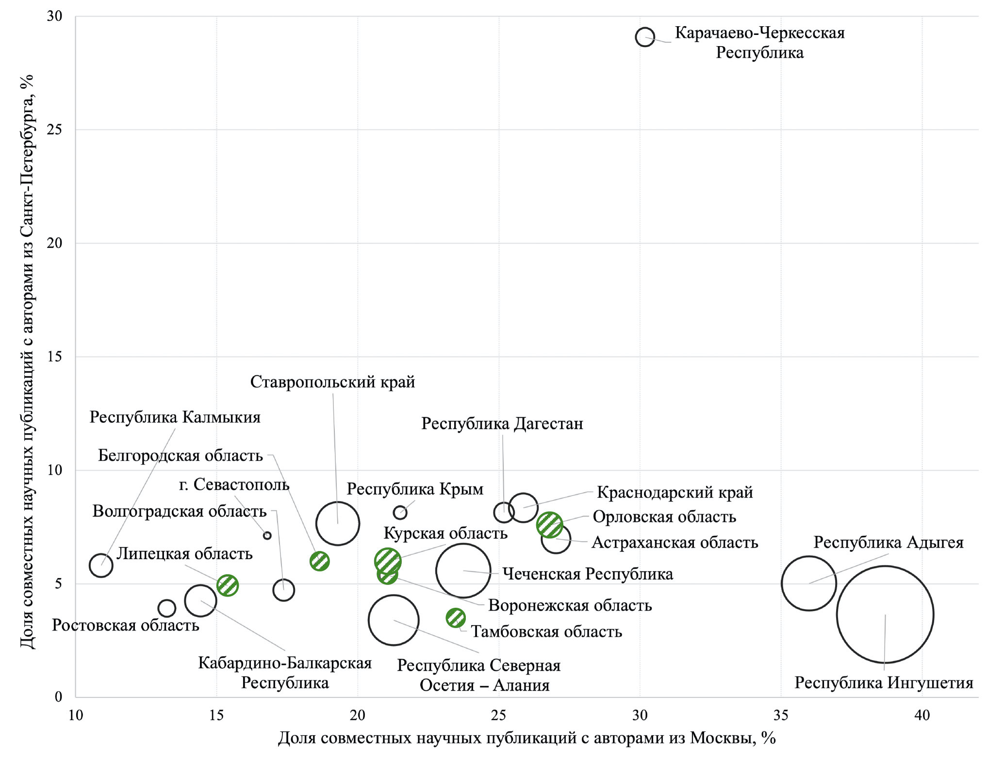 Примечание. Размер пунсона соответствует доле совместных публикаций авторов из данного региона с авторами из остальных регионов Большого Юга России, выраженной в %. Зеленые пунсоны со штриховкой соответствуют сопредельным регионам Большого Юга России.