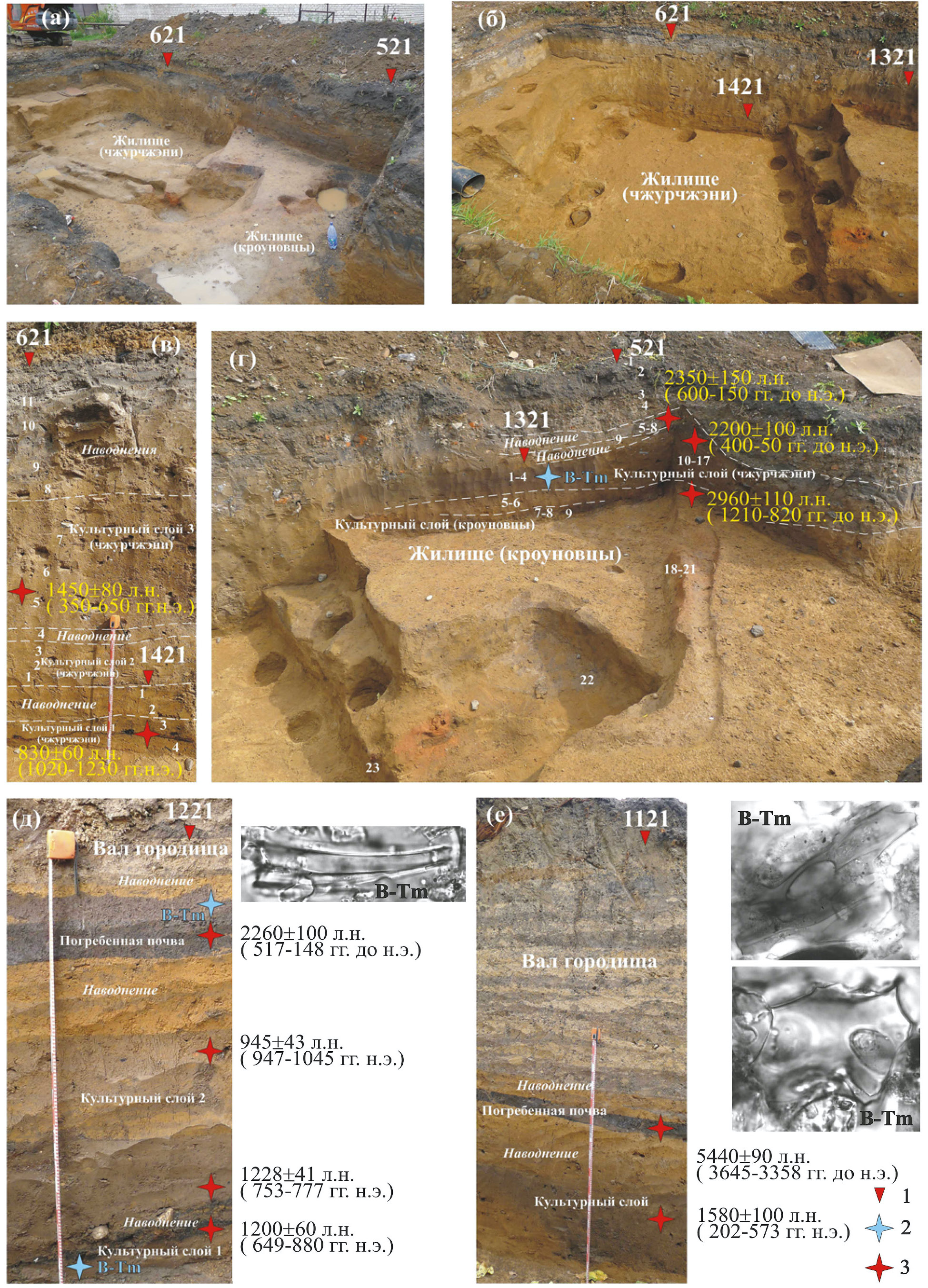 Рис. 2. Строение изученных разрезов: (а) основной раскоп, в основании которого вскрыты нижние части жилищ крауновцев и чжурчжэней с канами; (б) раскоп, вскрывший основания жилищ ниже канов; (в, г) изученные разрезы в основном раскопе с указанием положения отобранных образцов, 14С-дат и отложений крупных наводнений; (д, е) изученные разрезы в раскопе под валом городища; фото – вулканическое стекло B-Tm. 1 – изученные разрезы; 2 – находки криптотефры B-Tm; 3 – 14С-даты.