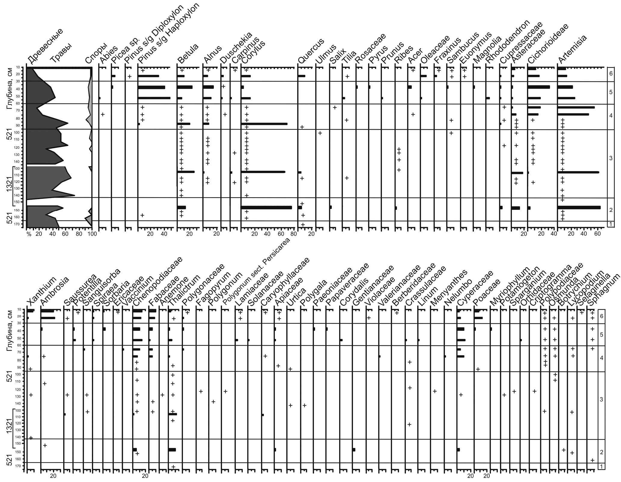 Рис. 3. Сводная спорово-пыльцевая диаграмма для разрезов 521 и 1321, основной раскоп, Южно-Уссурийское городище. 1 – материк; 2 – жилище кроуновцев; 3 – выбросы из жилища и культурный слой чжурчжэней; 4 – линза песка и покровные суглинки; 5 – строительный мусор XIX–XX вв.; 6 – почва. Палинолог Т.В. Корнюшенко.
