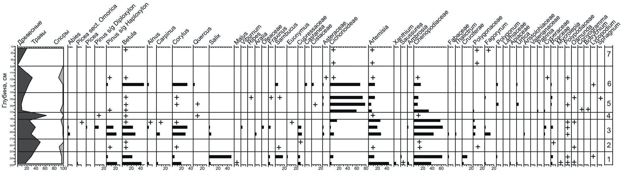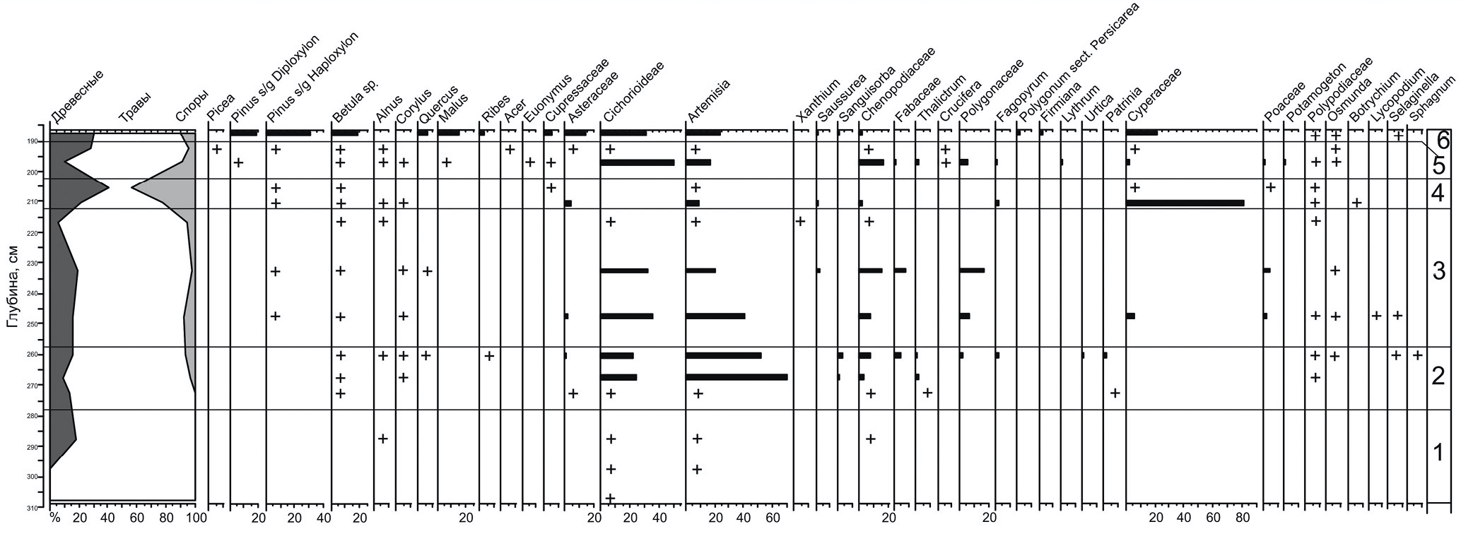 В группе трав преобладает пыльца растений сухих местообитаний (полынь, маревые и др.), найдена пыльца толстянковых, истода и патрэнии, характерных для сухих склонов. Единично встречена пыльца водных и водно-болотных растений (рдест, ежеголовник, вахта, осоки), которую люди могли переносить с водой. Увеличивается роль растений, характерных для нарушенных земель, в том числе встречается пыльца амброзии, дурнишника, крапивы. Обнаружена пыльца гречихи посевной, одной из зерновых культур, которые выращивали чжурчжэни (Артемьева, Болдин, 2015). Семена гречихи посевной известны на других городищах чжурчжэней (Васильева, Сергушева, 2014). Стала встречаться пыльца бобовых. Особенно много пыльцы других культурных растений, включая пыльцу капустных, в культурном слое 1. Возможно, на начальном этапе заселения поля и огороды находились ближе к жилищам. Здесь же встречено больше пыльцы злаков, возможно, часть могла принадлежать сорнякам. Найдена пыльца дурнишника и амброзии. В культурном слое 2 встречена пыльца кирказоновых (Aristolochiaceae) – лианы аристолохии маньчжурской, растущей в смешанных лесах в долине р. Раздольной. Палиноспектры из культурного слоя 3 показывают, что в окрестностях городища природные травянистые сообщества сменились антропогенными с преобладанием пыльцы цикориевых и участием пыльцы крапивы. Причем, судя по возрасту органогенного материала, эти растительные сообщества возникли уже в раннем средневековье (во временя культуры мохэ – 350–650 гг.). Многочисленные археологические памятники эпохи мохэ были найдены в бассейне р. Раздольной, в том числе в непосредственной близости от Южно-Уссурийского городища (Пискарева и др., 2019).