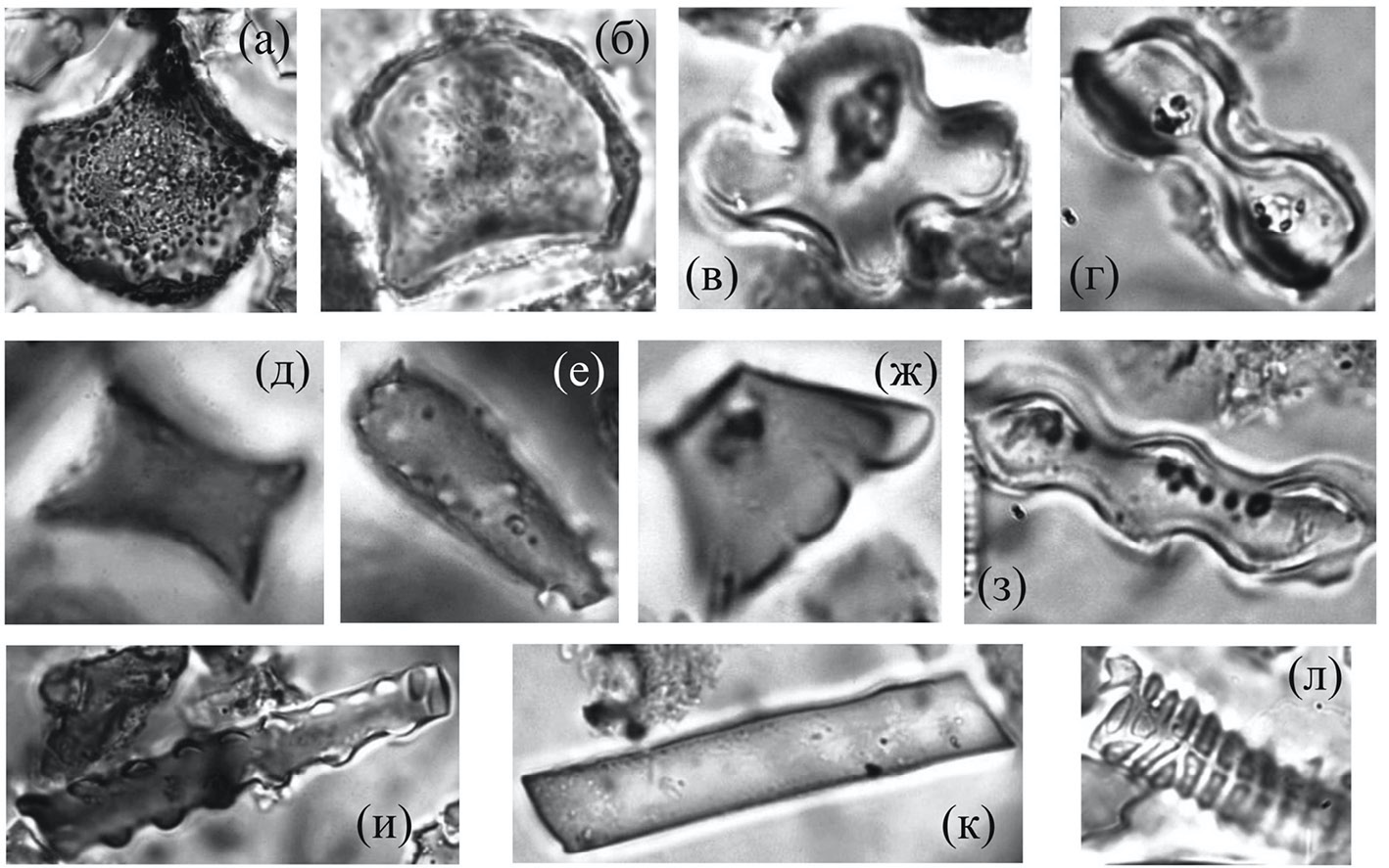 Рис. 5. Фитолиты из культурных слоев, образованных до постройки вала, Южно-Уссурийское городище: буллиформные фитолиты тростника (а) и предположительно риса (б); крестообразная короткая частица (в); двулопастная частица (г); трапециевидная короткая частица (д); трихома (е); усеченная конусовидная частица (ж); полилопастная частица (з); зубчатая палочка (и); пластина с ровными краями (к); перфорированная палочка (л).
