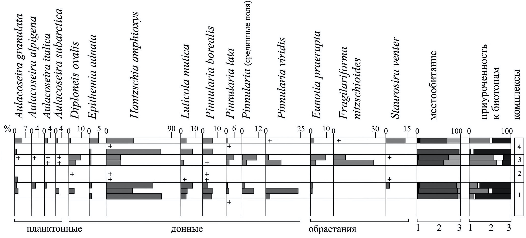 Признаки затопления территории выделяются в разрезах, вскрывших культурные слои, образованные до постройки крепости. В линзе песка с галькой (инт. 3.0–3.1 м) из разреза 1221 диатомеи малочисленны, концентрация составляет 2 тыс./г, встречены 9 таксонов диатомей, представленных почвенными и озерно-реофильными видами. Отложения образовались во время крупного наводнения. В верхней части культурного слоя 2 с пятнами желтого суглинка обнаружены планктонные и временно планктонные диатомеи (Aulacoseira granulata, A. distans, A. subarctica, Asterionella formosa, Tabellaria flocculosa, обрастатели Gomphonema acuminatum, Ulnaria ulna) и донные виды рода Pinnularia, что указывает на периодическое затопление поселения. Встречено много изломанных створок крупных видов рода Pinnularia. Общее содержание диатомей, обитавших в водной среде, достигает 53.9%. Появление эпифита Staurosira venter, характерного для небольших мелководных озер, Cocconeis placentula, Epithemia turgida и ацидофилов Eunotia praerupta, E. glacialis, Stauroneis kriegeri и др. (до 5.9% в сумме) показывает, что во время наводнений шел перенос материала из стариц и заболоченных участков долины.