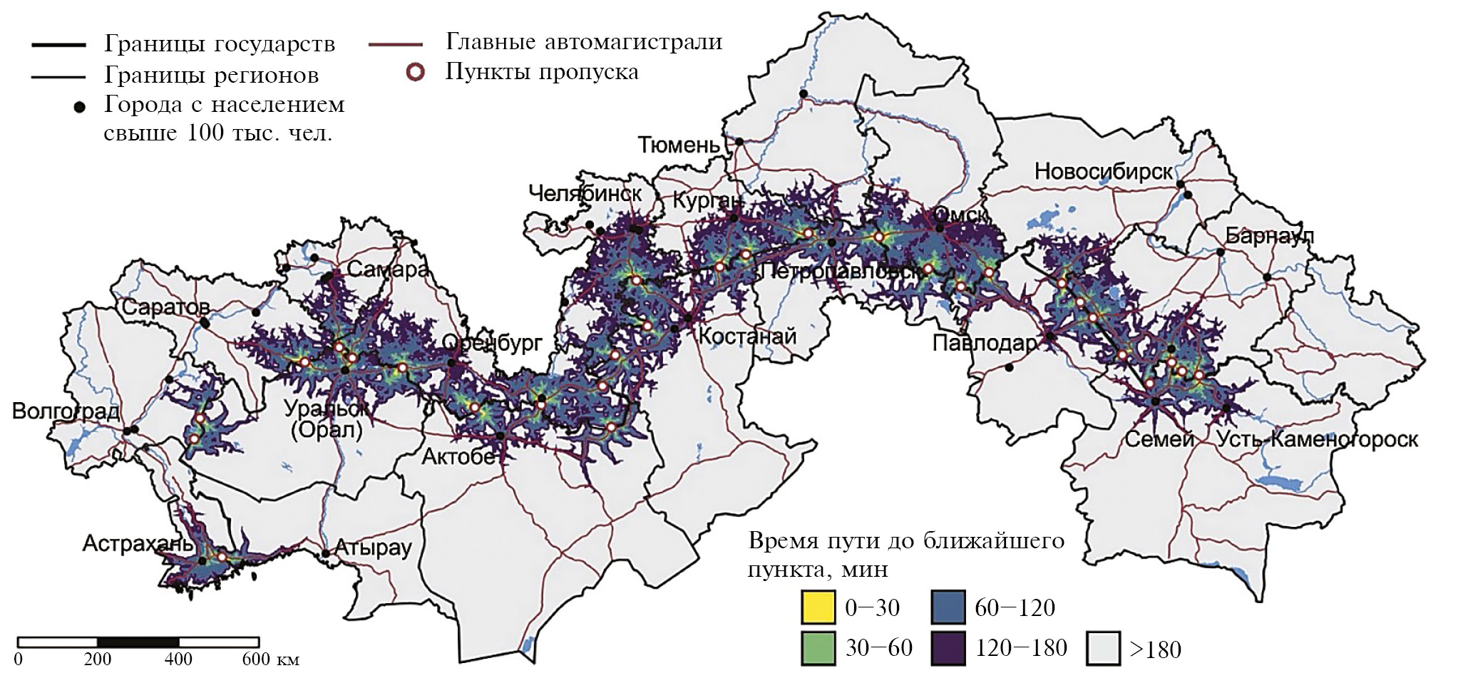 Российско-казахстанское пограничье служит хорошей иллюстрацией того, как особенности проницаемости границы, плотность и специфика конфигурации транспортных путей могут влиять на транспортную доступность соседа.