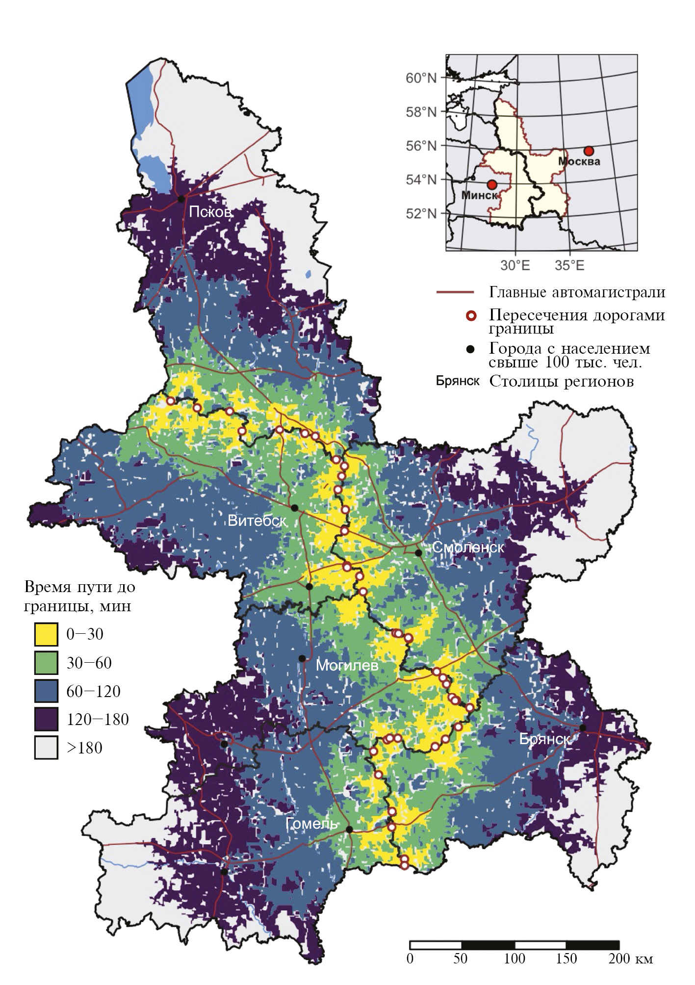 Обычно привычными точками отсчета для измерения транспортной доступности территории выступают населенные пункты, в нашем же случае этими точками стали места пересечения государственной границы. Такой подход, во-первых, позволяет при расчете транспортной доступности границы учитывать ее проницаемость – один из наиболее универсальных индикаторов уровня барьерности границы.