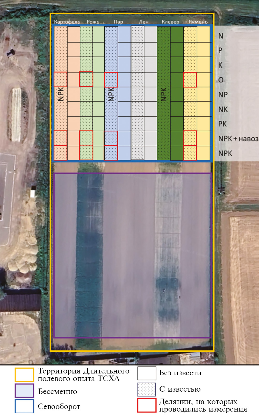 Рис. 1. Схема Длительного полевого опыта Тимирязевской сельскохозяйственной академии (ТСХА) с расположением исследуемых делянок в 2023 г.