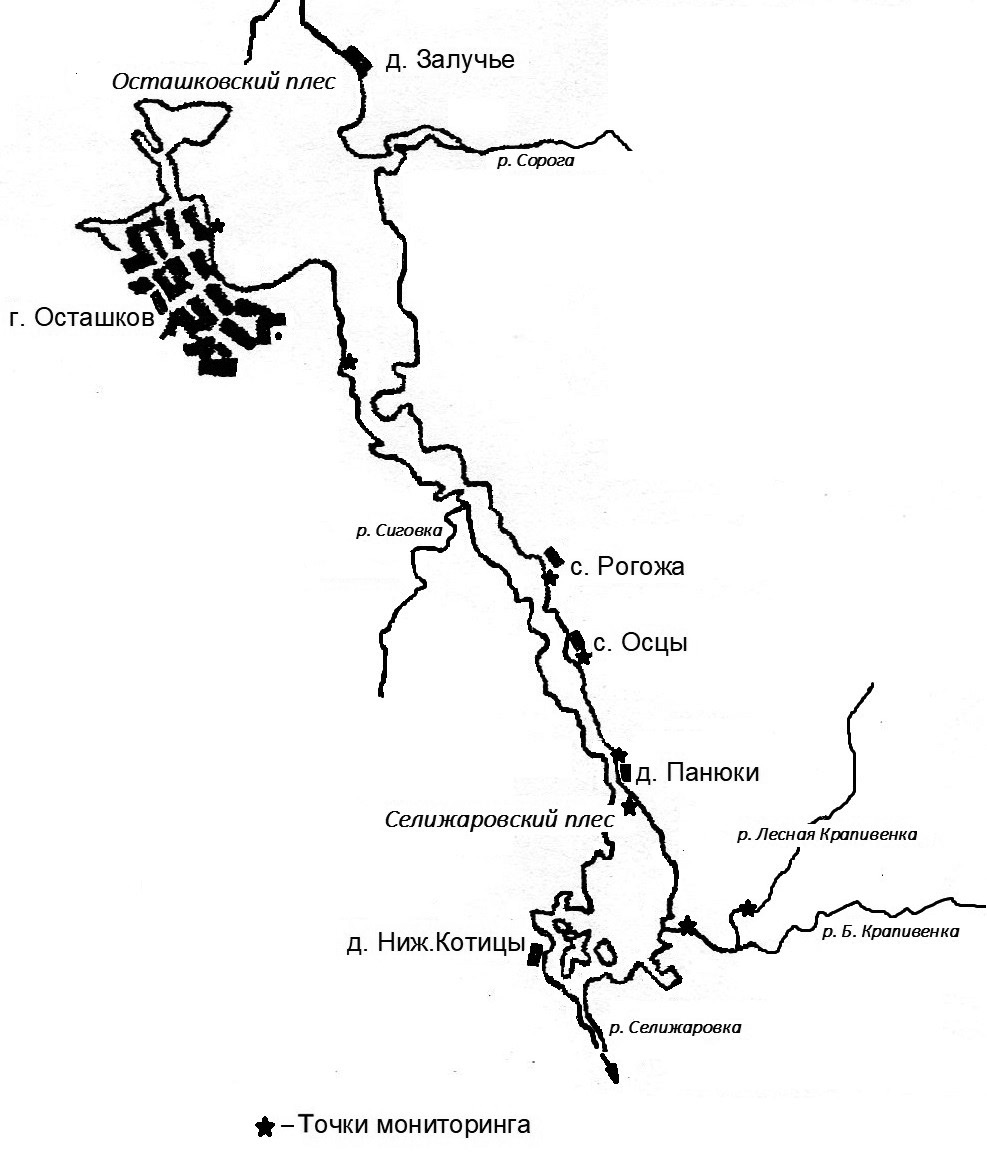 Объекты исследования – акватории Осташковского (Городского) и замыкающего Селижаровского плёсов, небольшие реки с лесным водосбором, родники и колодцы в прибрежной селитебной части Селижаровского плёса (рис. 1). На этих объектах пробы воды отбирались в разные сезоны года. Основное внимание уделялось анализу содержания в притоке биогенного элемента – фосфора и микроэлементов.