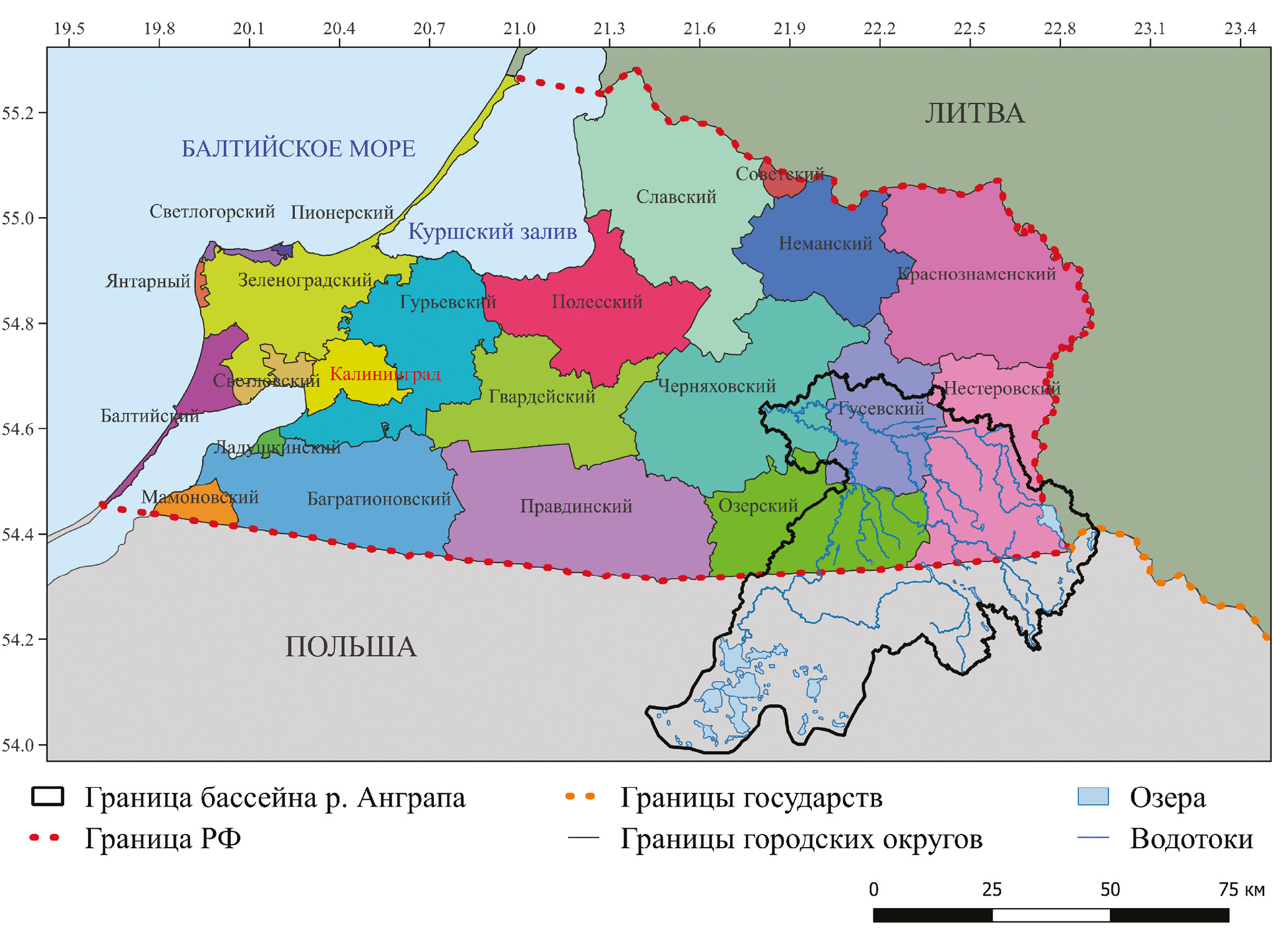 Калининградская область, занимающая площадь в 15100 км 2 , обладает разнообразием географических условий, формирующих геоэкологическое состояние рек и их бассейнов. Юго-восточная часть Калининградской области относится к бассейну р. Анграпы. В качестве объектов исследования рассматриваются сама р. Анграпа и ее притоки: Писса, Красная и Русская. Эти водотоки относятся к бассейну р. Преголи, которая впадает в Вислинскую лагуну и в значительной степени влияет на ее экологическое состояние. Район исследования выделяется трансграничным расположением (рис. 1), расчлененным рельефом, интенсивным водообменом между подземными и поверхностными водами, высокой густотой речной сети, ландшафтным разнообразием, наличием особо охраняемых природных объектов, сельскохозяйственной специализацией. Можно констатировать природную уникальность изучаемых речных систем и их региональную значимость. Мониторинг гидрологического и гидрохимического состояния отмеченных рек не отвечает современным требованиям, в особенности пространственным и временным критериям, что приводит к отсутствию высококачественного информационного обеспечения оценок их состояния и рационального использования. Эти обстоятельства формируют актуальность проводимых нами исследований.