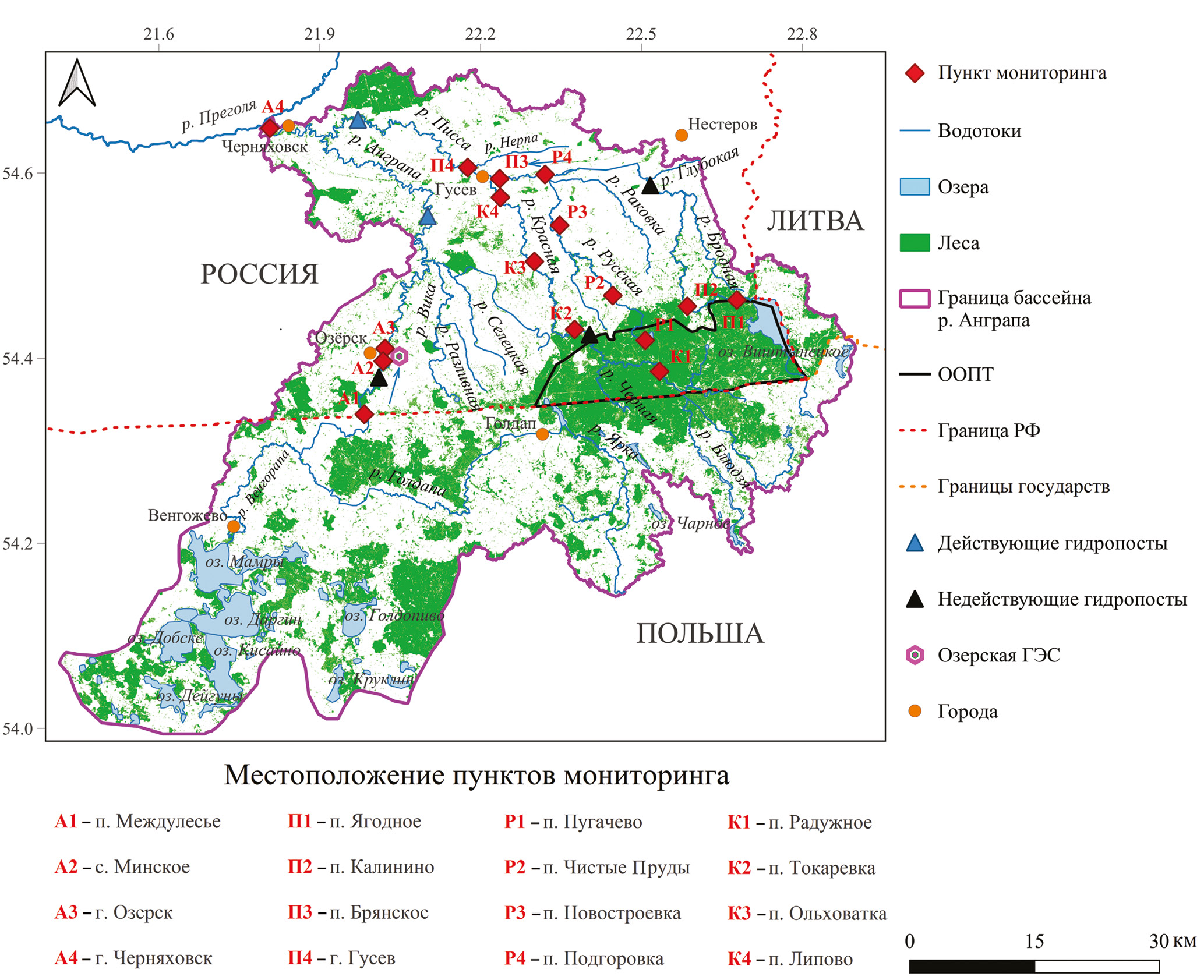 Основные актуальные исследования бассейна посвящены в большинстве физико-географическим и гидрологическим свойствам рек (Ахмедова, Наумов, 2022; Берникова и др., 2019; Тылик, 2021; Шамонина, Нелюбина, 2017), а исследования химического состояния и загрязненности рек (Нагорнова и др., 2011) недостаточны и отчасти устарели. Имеются пункты длительного систематического мониторинга р. Анграпы (д. Берестово) и р. Писсы (д. Зеленый Бор)4, но по двум точкам в разных реках сложно характеризовать бассейн, а также выявлять причины возникновения загрязнений. Поэтому мы решили расширить в несколько раз наблюдательную сеть до 16 пунктов.