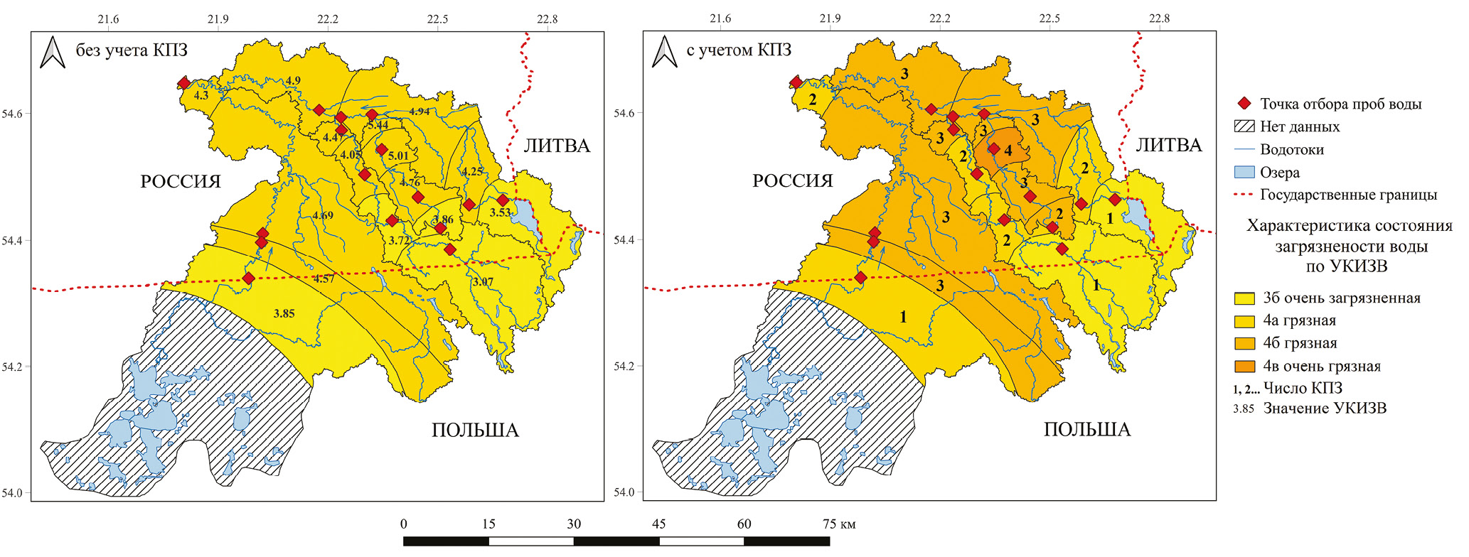 В качестве предельно допустимых концентраций (ПДК) использовался рыбохозяйственный норматив6. Рассчитаны кратности превышения ПДК гидрохимических показателей, удельный комбинаторный индекс загрязнения воды (УКИЗВ) с учетом и без учета критических показателей загрязнения (КПЗ) за гидрологический год и индекс загрязнения воды (ИЗВ) по гидрологическим сезонам7.
