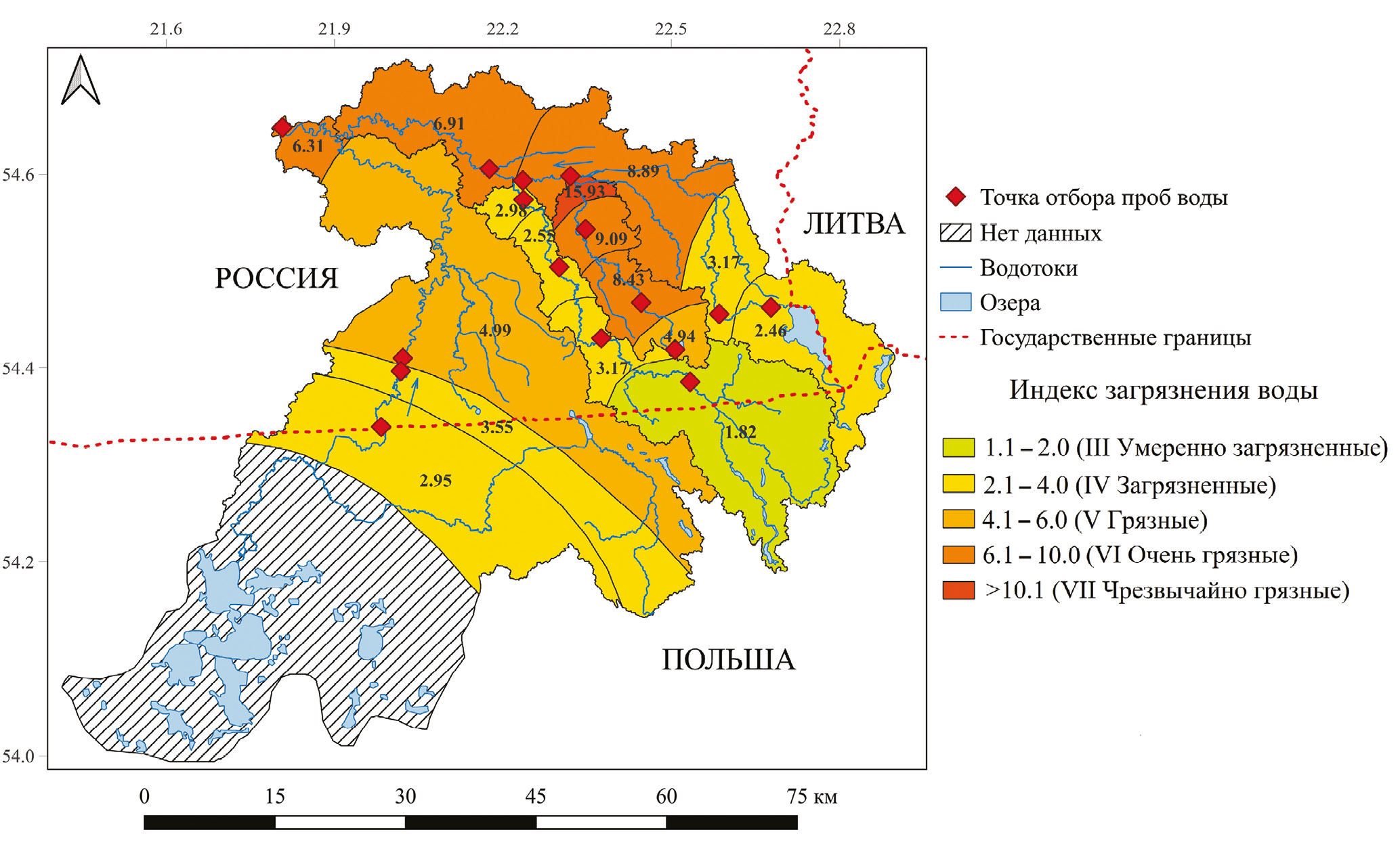 Качество вод рек юго-восточной части Калининградской области по удельному комбинаторному индексу загрязнения вод изменяется от очень загрязненной до грязной (с учетом КПЗ от очень загрязненной до очень грязной), по индексу загрязнения вод от загрязненной до чрезвычайно загрязненной. В соответствии с обоими индексами качество речных вод закономерно ухудшается от верховьев, которые находятся в лесных угодьях, к средним и устьевым частям в связи с увеличением аккумуляции реками стоков с сельскохозяйственных земель, населенных пунктов и индивидуальных домохозяйств. Наибольший вклад в значения индексов загрязнения вод и, соответственно, качества вод вносят высокие концентрации нефтепродуктов и железа, повышенные значения ХПК и БПК, сульфатов, аммония, нитритов, фосфатов. Показатели ИЗВ и качество вод изучаемых рек изменяются: в бассейне р. Анграпы от 2.95 до 6.31 (классы качества вод: загрязненные–грязные–очень грязные), в бассейне р. Писсы от 2.46 до 8.89 (классы качества вод: загрязненные–очень грязные), в бассейне р. Красной от 1.82 до 3.17 (классы качества вод: умеренно загрязненные–грязные), в бассейне р. Русской от 4.94 до 15.93 (классы качества вод: грязные–очень грязные–чрезвычайно грязные).