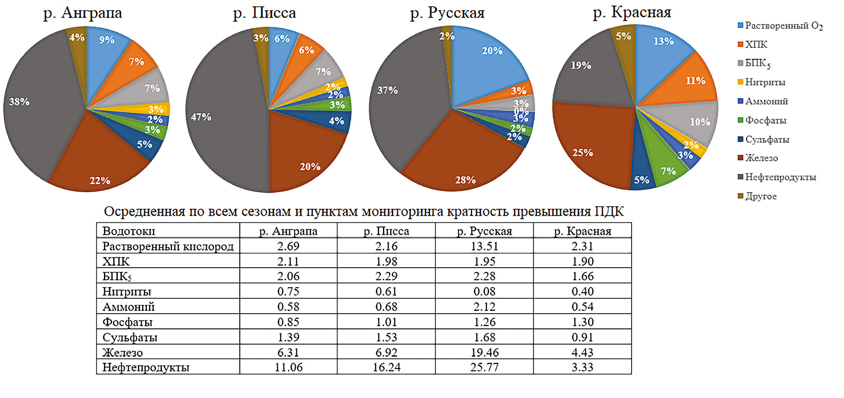 В р. Анграпе концентрации железа превышают ПДК в 100% измерений, нефтепродуктов в 93.75% измерений, БПК в 93.75% измерений, сульфатов в 81.25% измерений, ХПК в 68.75% измерений, растворенного кислорода в 37.50% измерений, фосфатов в 31.25% измерений, аммония в 25.00% измерений. Кратности превышений ПДК имеют следующие осредненные распределения и годовые интервалы: железо 22% (1.51–11.34), нефтепродукты 38% (2.40–73.00), БПК5 7% (1.05–3.29), сульфаты 5% (1.04–2.00), ХПК 7% (1.56–3.65), растворенный кислород 9% (3.81–3.87), фосфаты 3% (1.34–2.82), аммоний 2% (2.24–3.22).