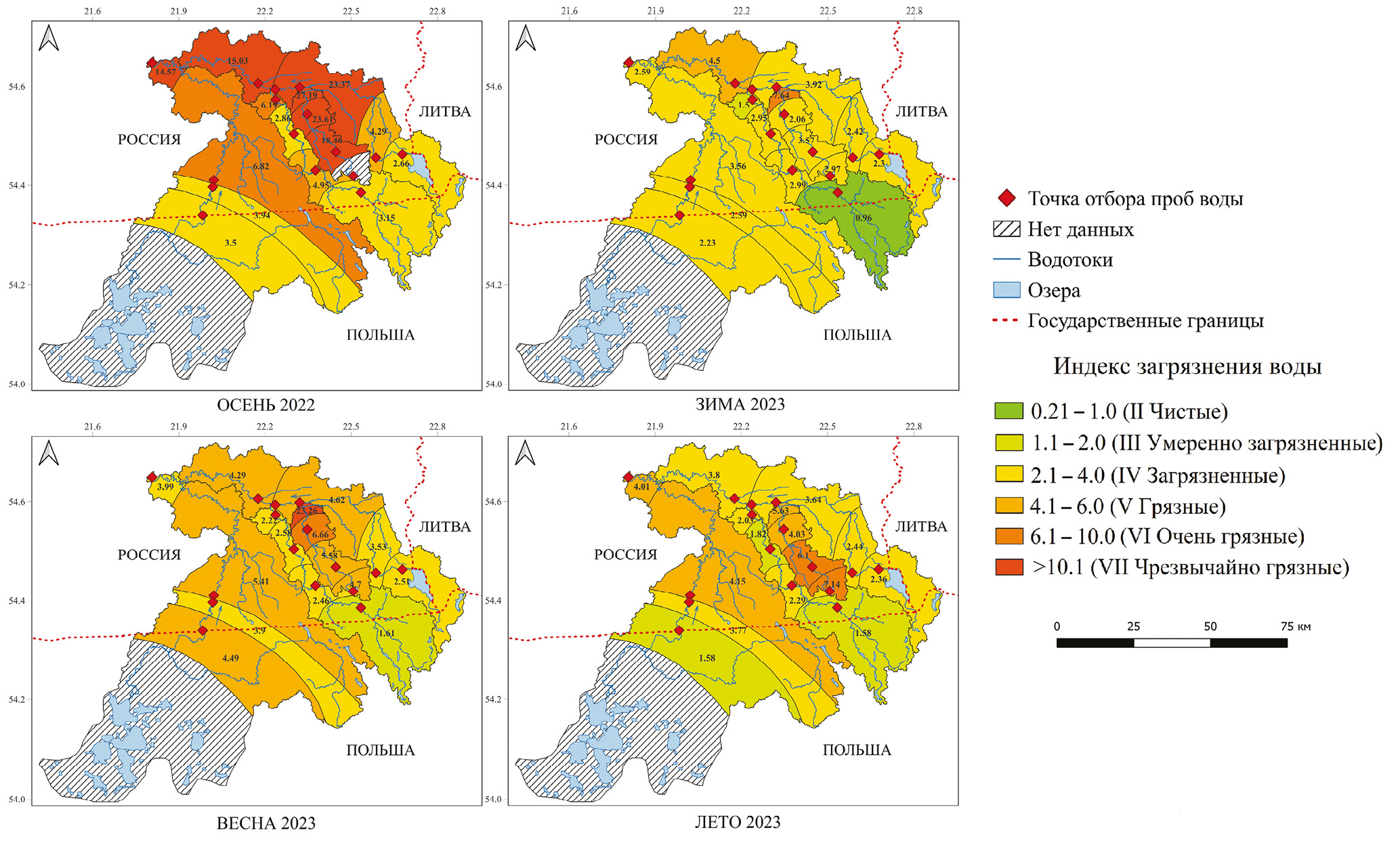 Рис. 3. Пространственное распределение удельного комбинаторного индекса загрязнения воды в бассейне р. Анграпы по четырем гидрологическим сезонам в 2022–2023 гг.