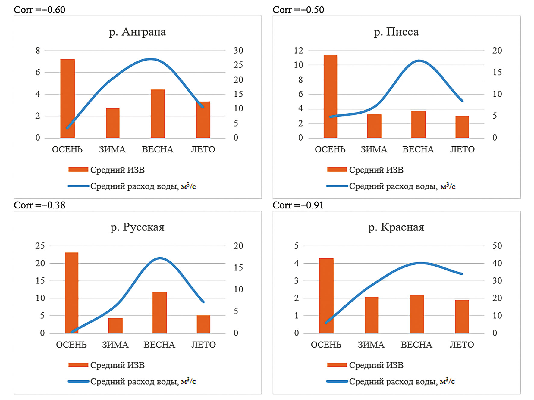 Коэффициент Пирсона показывает высокую отрицательную корреляцию (от –0.91 до –0.50) между этими параметрами для рр. Красной, Анграпы и Писсы. Исключение составляет р. Русская, для которой коэффициент составляет: –0.38.