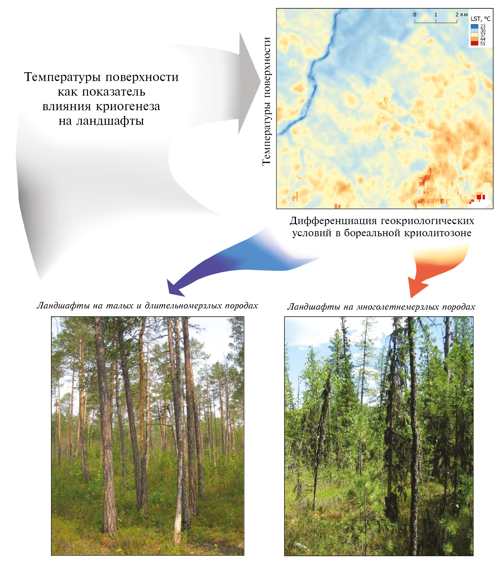 Лесные ландшафты, выделяющиеся по наиболее низким термическим значениям (см. рис. 2), характеризуются минимальным выбросом явного тепла и имеют самый высокий потенциал влагообмена, “сопротивляясь” нагреву приземного воздуха и иссушению лесных горючих материалов в пожароопасный период. Они имеют наибольшие запасы фитомассы и более сложную структуру растительного покрова (Медведков, Котова, 2020; Medvedkov et al., 2023). В бореальной криолитозоне такие природные комплексы приурочены прежде всего к талым, в меньшей степени – к длительномерзлым породам, т. е. участкам, характеризующимся отсутствием или меньшей степенью влияния процессов криогенеза на ландшафты, что было установлено в результате синтезированного анализа температур поверхности и данных полевых исследований.