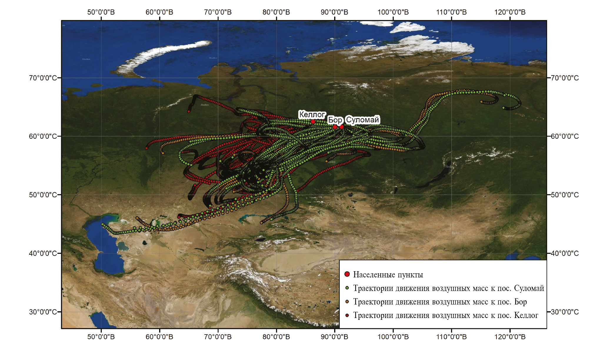 Возможность усиления влияния внешних по отношению к Среднеенисейскому региону источников экологической опасности установлена на основе расчета обратных траекторий движения воздушных масс по дисперсионной модели HYSPLIT (рис. 3), разработанной американским Национальным агентством по океану и атмосфере (NOAA). В ходе изучения данного вопроса выявлено, что современные изменения циркуляционного режима в Сибири характеризуются усилением меридионального переноса воздушных масс, как в летнее, так и в зимнее время. Так, летом заметно увеличилось влияние северо-западного и северного направлений, а зимой – южного и юго-западного. В этих условиях возрастает вероятность влияния “разреженной биосферы”, в частности Приаралья (см. рис. 3). Об этом свидетельствуют не только расчетные данные, выполненные для разных высот (Медведков и др., 2023; Ge et al., 2016), и полученные на их основе траектории движения воздушных масс, но и наблюдения местного населения, рассказывающие о явлении “желтого снега”, по-видимому, насыщенного тонкодисперсной пылью (Медведков и др., 2023). Опираясь на эти данные, сформулировано предположение, что Приаралье для рассматриваемого региона является поставщиком, преимущественно в зимнее время, аэрозольных минеральных частиц, которые могут сорбировать загрязняющие вещества. Насколько это значимо для экосистем и населения регионов Сибири – открытый вопрос и тема для дальнейших исследований. Этот аспект, тем не менее, необходимо принимать во внимание при анализе актуальных геоэкологических вызовов.