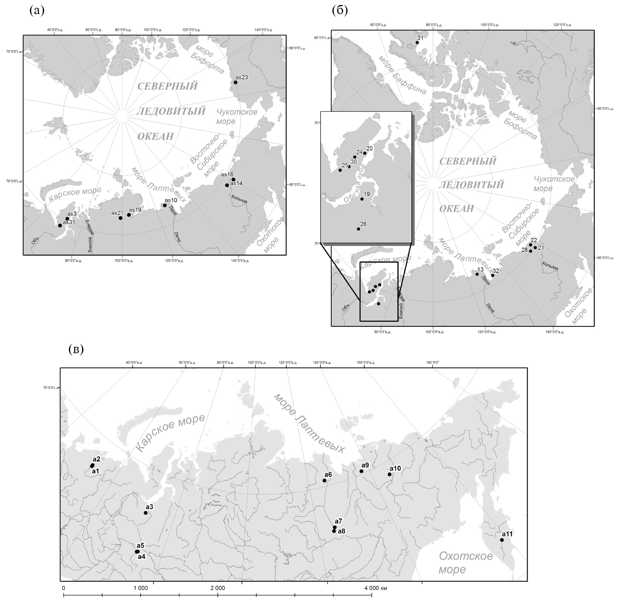 Для проведения исследований выбраны 28 участков, разных в геоморфологическом, геокриологическом и физико-географическом отношении и расположенных в различных регионах – Печорская низменность, полуостров Ямал, Западно-Сибирская равнина, Северо-Сибирская низменность, дельта р. Лены, Колымская низменность, Центрально-Якутская равнина, Центрально-Камчатская низменность, Арктическая низменность (Аляска). Площадь одного участка составляла в основном 200–1200 км2. Участки, по данным государственной геологической съемки, сложены разнообразными отложениями – песчаными дельтовыми отложениями; озерно-аллювиальными горизонтально слоистыми алевритами, переслаивающимися с песками и торфами, а также суглинками и супесями, аллювиальными и аллювиально-морскими отложениями (суглинками, супесями и песками), флювиогляциальными песками и валунными суглинками, морскими отложениями, представленными пылеватыми песками, песчаными, супесчаными и суглинистыми отложениями, озерно-болотными образованиями. Для возвышенных участков характерно сплошное распространение многолетнемерзлых пород. Расположение участков представлено на рис. 2.