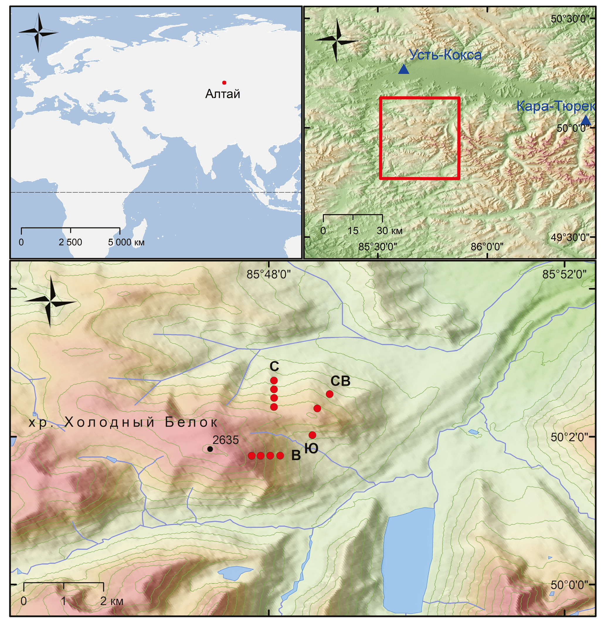 Рис. 1. Расположение района исследования на хр. Холодный Белок, Алтай (синими треугольниками отмечены метеостанции, красными кружками – высотные профили)