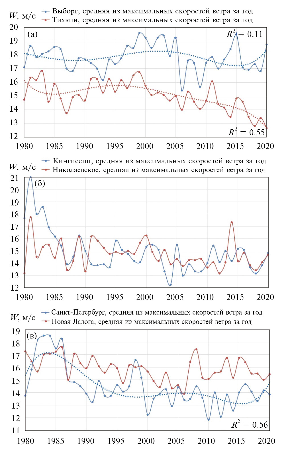 Представленные на рис. 4 данные об изменчивости средних за год максимальных за каждый месяц скоростей ветра свидетельствуют, что в Ленинградской области имеются значительные территориальные различия по этой характеристике. Как видно из рис. 4а, на севере области в районе г. Выборга скорости ветра оказываются существенно выше в среднем (около 18.5 м/с), чем на востоке в районе г. Тихвина (около 15 м/с) за анализируемый период. Кроме того, заметна достаточно выраженная тенденция, подтверждаемая значимым полиномиальным трендом, к снижению скоростей ветра в г. Тихвин Ленинградской области. В соответствии с этим возможно ожидать в северных районах Ленинградской области больший ущерб для жилищно-коммунального хозяйства. На западе Ленинградской области (Кингисепп), а также в Санкт-Петербурге и на южном побережье Ладожского озера (Новая Ладога) формируются в целом общие тенденции, выражающиеся в уменьшении средних за год максимальных за каждый месяц скоростей ветра, начиная с 1980-х годов – от довольно высоких значений 18–21 до 15–16 м/с в настоящее время.