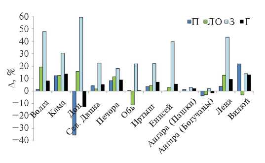 Рис. 1. Относительные изменения (∆, %) стока половодья (П), летне-осеннего (ЛО), зимнего (З) и годового (Г) стока в период современного глобального потепления (начиная с 1981 г.) в сравнении со стоком базового периода (1930–40-е – 1980 гг.), рассчитанные по многолетним данным о стоке, из которых исключены антропогенные изменения. Информация о створах приведена в табл. 1.
