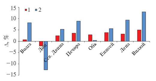 Рис. 2. Относительные изменения годового стока (∆, %) в период современного глобального потепления в сравнении со стоком базового периода, рассчитанные по уравнению водного баланса и данным об атмосферных осадках и температуре воздуха, осредненным по ансамблю глобальных климатических моделей программы CMIP5 (1), и по многолетним данным о стоке с исключенными антропогенными изменениями (2).