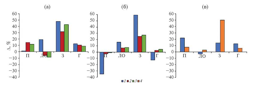 Рис. 3. Относительные изменения (∆, %) годового стока (Г), стока половодья (П), летне-осеннего (ЛО) и зимнего (З) стока Волги (а), Дона (б) и Вилюя (в): в период современного глобального потепления в сравнении со стоком базового периода рассчитанные по многолетним данным о стоке с исключенными антропогенными изменениями (1), в период сценарного потепления в 2010–2039 гг. – по модели месячного водного баланса и сценарным данным об атмосферных осадках и температуре воздуха, осредненным по данным ансамбля глобальных климатических моделей программы CMIP5 для сценариев RCP2.6 и RCP8.5 соответственно в сравнении со стоком базового периода 1931–1980 гг. (2, 3), в период сценарного потепления 2035–2065 гг. – в сравнении со стоком базового периода 1971–2000 гг. (4). Более детальная информация – в тексте.
