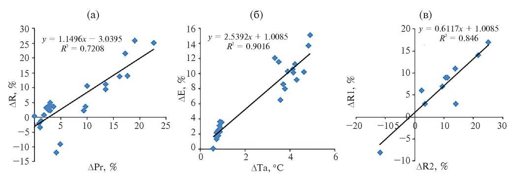 Рис. 5. Регрессионные зависимости между относительными (%) сценарными изменениями, полученными для рассмотренных крупных речных бассейнов по данным ансамбля глобальных климатических моделей по климатическому сценарию RCP8.5 программы CMIP5: (а) годового стока и годовых атмосферных осадков для периода 2040–2069 гг.; (б) годового испарения и годовой температуры воздуха для периода 2040–2069 гг.; (в) годового стока, рассчитанного авторами по уравнению годового водного баланса для периода 2040–2069 гг. (∆R2) и полученными в (Георгиевский, Голованов, 2019) для периода 2041–2060 гг., по расчетам на ансамбле глобальных климатических моделей (∆R1).