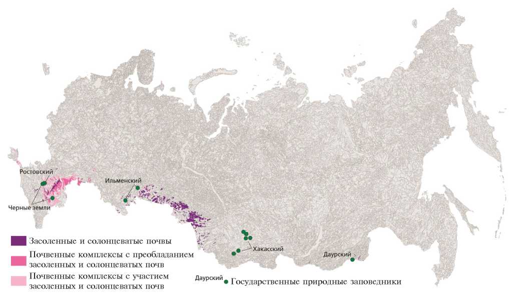 Засоленные и солонцеватые почвы и комплексы почв занимают в России менее 1% площади почвенного покрова страны (см. рис. 1), встречаются на территориях пяти заповедников, максимальную площадь (72% охраняемой площади группы) они занимают в Даурском заповеднике. Распространение засоленных и солонцеватых почв и комплексов почв на территории России (на фоне полигонов Почвенной карты) и расположение ООПТ, в почвенном покрове которых встречаются почвы группы, демонстрирует рис. 2. На картосхеме наглядно видно, что все ООПТ размещены на границе ареалов типичного распространения засоленных и солонцеватых почв.