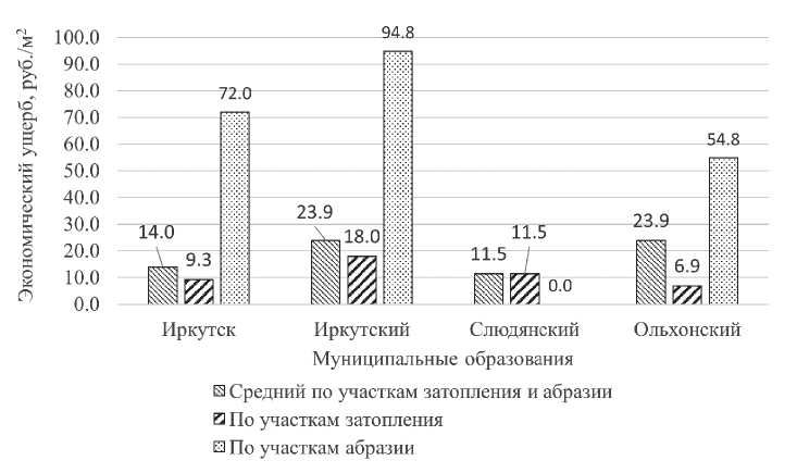 Доли лесопокрытой площади и ПЭУ на участках затопления и абразии по категориям земель распределены следующим образом: на земли лесного фонда приходится соответственно 63.7 и 62.3%, на земли с неопределенной категорией — 21.6 и 20.8, населенных пунктов — 7.2 и 5.2, ООПТ — 5.6 и 10.3, сельскохозяйственного назначения — 1.6 и 1.2, промышленности — 0.3 и 0.2%. При этом в Слюдянском районе доли лесопокрытой площади и ПЭУ от общих их значений на исследуемой территории занимают соответственно 51.2 и 33.6%, в Иркутском — 38.5 и 52.5, Ольхонском — 10.0 и 13.7, в г. Иркутске — 0.3 и 0.2 (см. табл. 2). Наиболее значительна площадь лесов, находящихся на участках негативного воздействия вод, ‒ на южных побережьях Байкала (Слюдянский район). Однако максимальный ПЭУ может быть достигнут на побережьях Иркутского водохранилища (Иркутского район) за счет более высокой лесистости и наличия высокопродуктивных древостоев, часть которых находится на абразионных участках, где удельная величина ущерба на единицу лесопокрытой площади значительно выше, чем на участках затопления, за счет потенциальной безвозвратной гибели лесов (рис. 1).