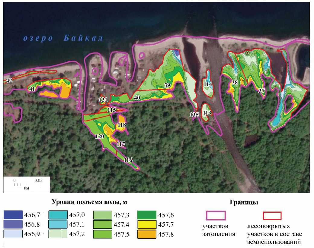 В качестве примера приведен фрагмент карты (рис. 2, табл. 4), отображающий часть Слюдянского района, которая в лесорастительном отношении является типичной для большей части исследуемой территории. Кроме того, он демонстрирует уровни, находящиеся ниже 457.0 м, которые не учитываются при расчете ПЭУ, однако важны для понимания общей картины распределения на побережье высотных уровней и земель, покрытых лесом. Кроме того, из рисунка видно, что основная часть лесопокрытых земель находится на отметках выше 457.2 м. Аналогичная ситуация характерна для всех остальных исследуемых побережий. Распределение ПЭУ по видам лесных ресурсов (табл. 5) показало, что более 80% от общего значения ПЭУ занимают ущербы от потенциальной гибели и повреждений древесных ресурсов, менее 20% приходится на прочие ресурсы леса (пищевые, недревесные и лекарственные).