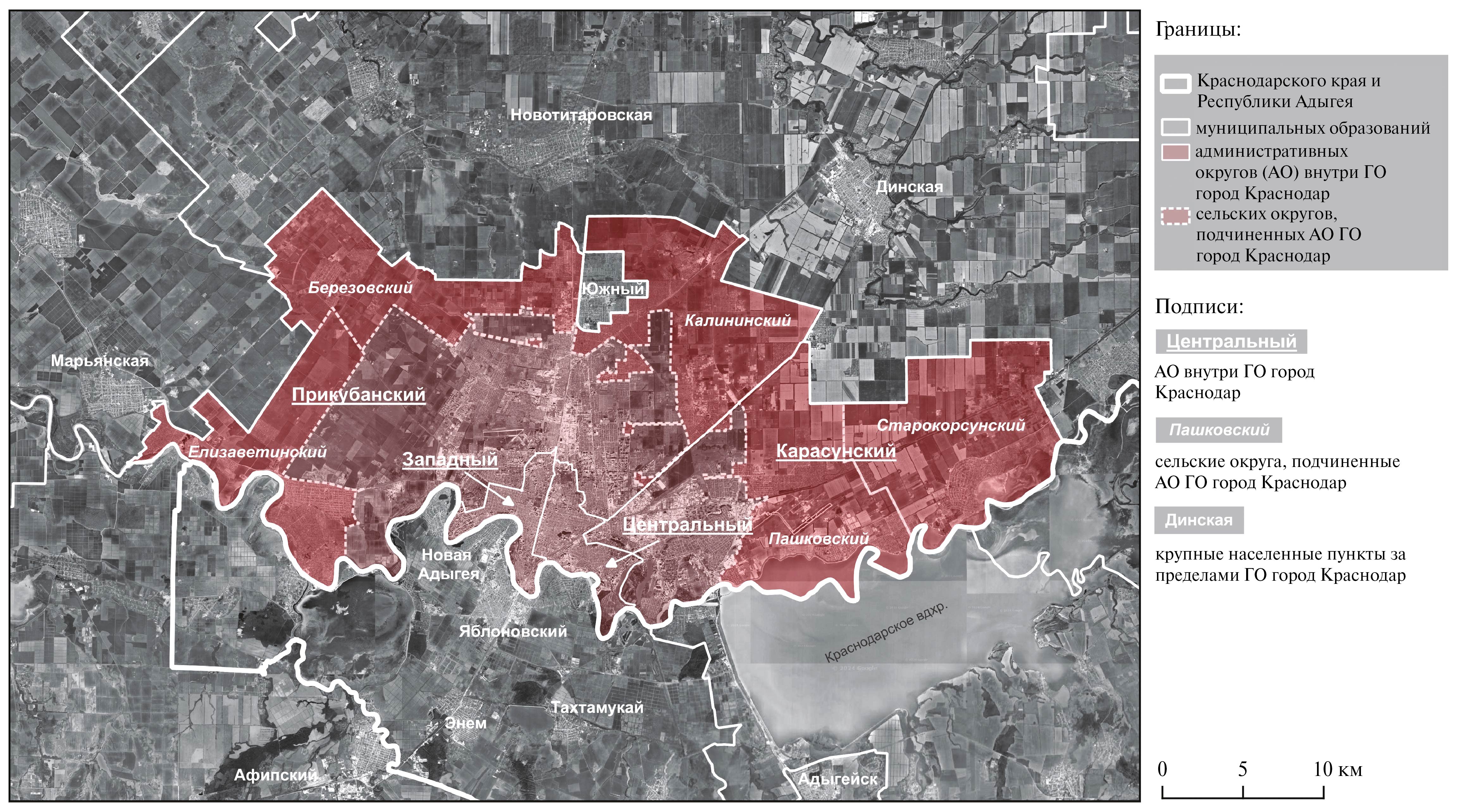 В 2004 г. Законодательным собранием Краснодарского края был принят закон “Об установлении границ муниципального образования город Краснодар и наделении его статусом городского округа”, в 2019 г. внешние и внутренние границы городского округа были зарегистрированы в Росреестре, а в региональный закон были внесены поправки: г. Краснодар был назначен административным центром городского округа (ГО) Краснодар. То, что эти две сущности были юридически разделены, заставляет задуматься, а не правильнее ли было интерпретировать ГО Краснодар в терминах агломерации?