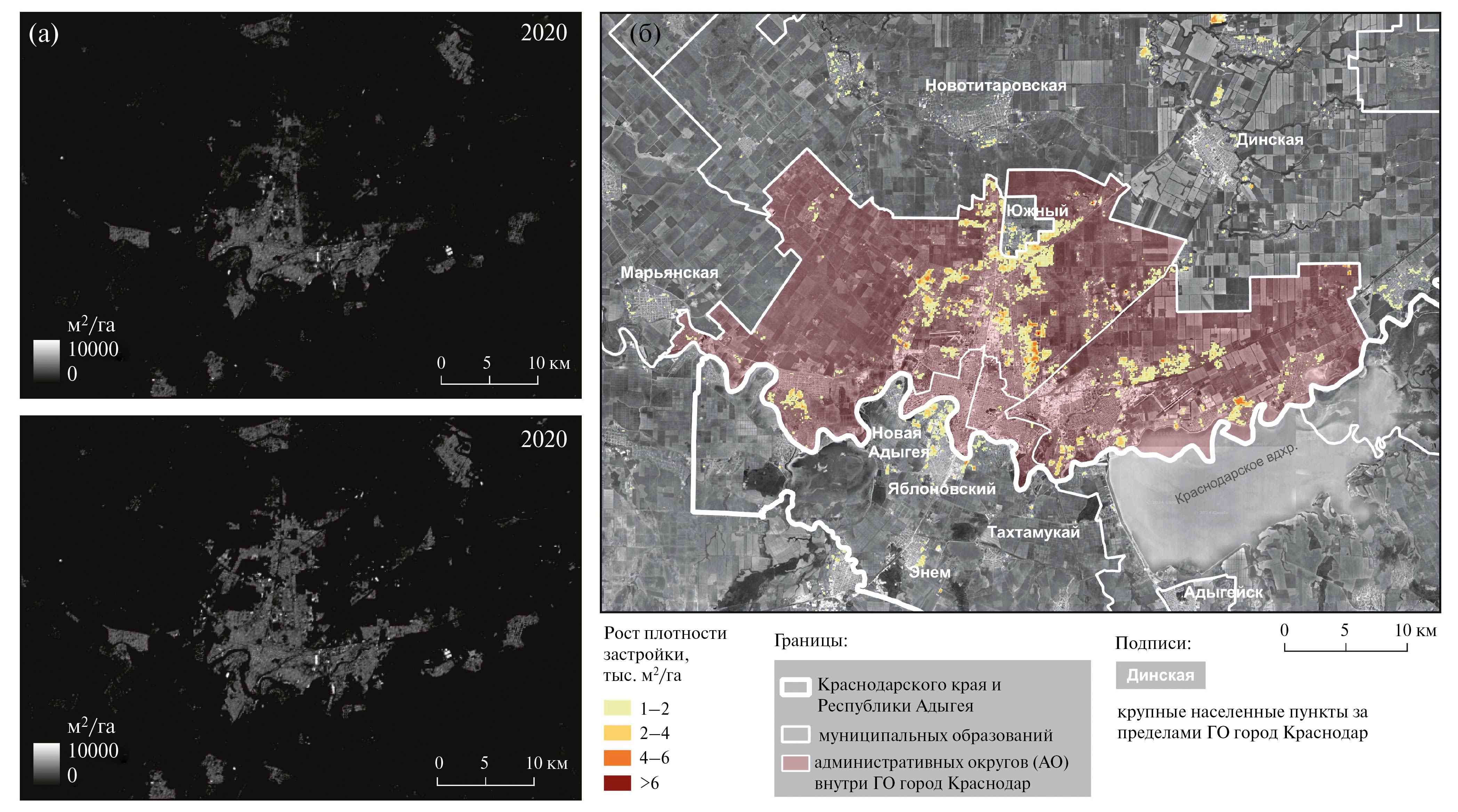 Рис. 2. Рост городской застройки городского округа Краснодар, 2010–2020 гг.: (а) плотность застройки в 2010 и 2020 гг., м2/га; (б) ареалы роста многоэтажной и малоэтажной жилой застройки. Примечания: расчеты авторов по методике (Pesaresi and Politis, 2023); базовая карта: © Google Satellite.