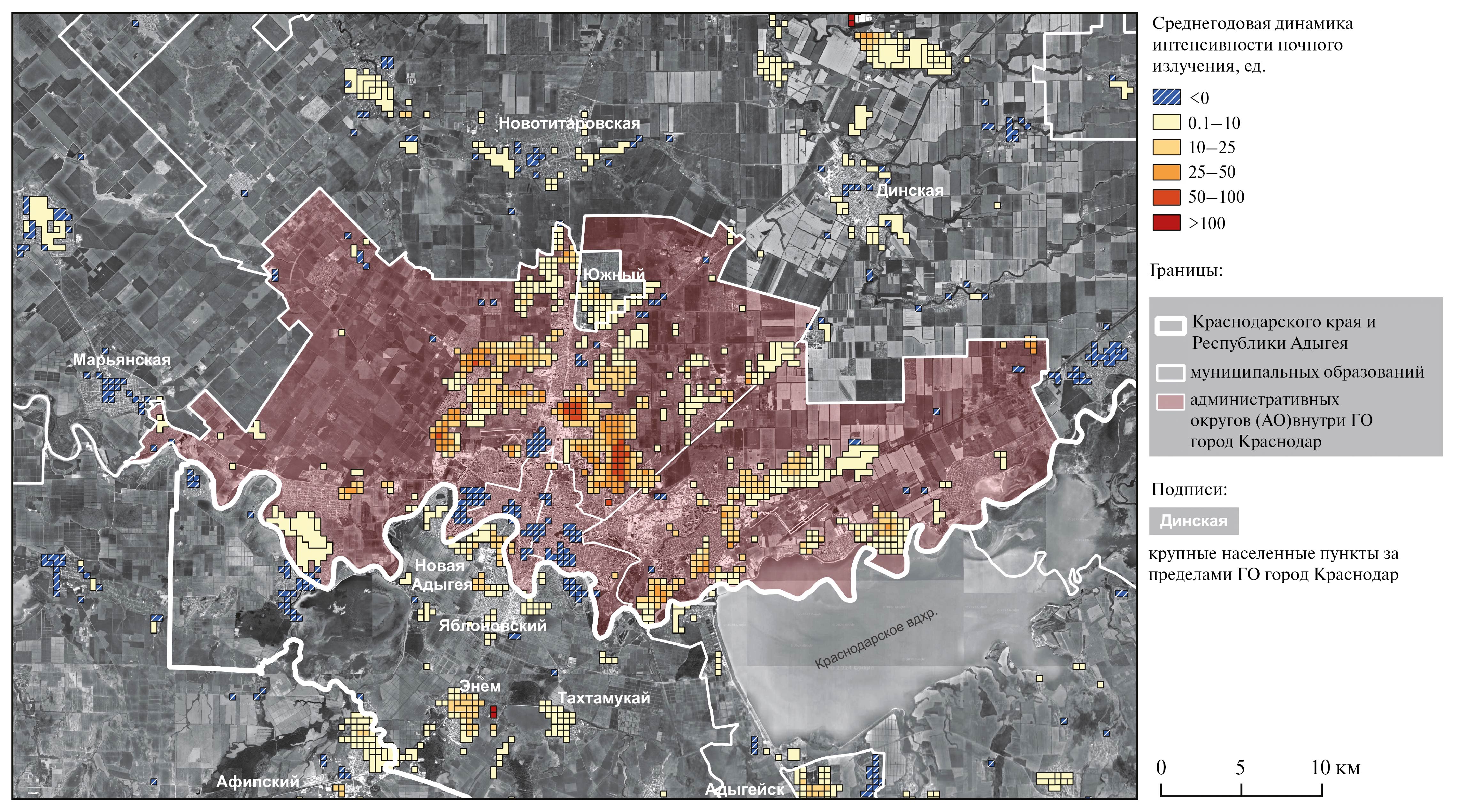 По показателю слабо выраженной динамики освещенности отчетливо выделяются “старые” центры Краснодарской агломерации. Особенно обширной является центральная зона Краснодара, где реализация новых девелоперских проектов затруднена в силу отсутствия необходимых земельных ресурсов и наличия множества ограничений. По сути, это и есть “ядро” агломерации, в состав которого входят территории дореволюционного и отчасти советского Краснодара, достигшее на современном этапе городского развития своих пределов. Возникновение здесь новой волны строительной активности потребует обновления градостроительной идеологии и ре-девелопмента. Тот же признак указывает и на наличие субагломерационных центров (ядер) в границах и за пределами городского округа. К погасшим ареалам девелоперской активности вплотную примыкают сияющие зоны реализации новых строительных проектов, конфигурация которых повторяет и уточняет конфигурацию растущего пятна городской застройки. При этом, чем ближе к “ядру” агломерации и ее субцентрам расположены землеотводы, тем интенсивнее они осваиваются, а чем ближе к административной границе, тем точнее они повторяют ее очертания. Эти незначительные детали проявляют две существенные особенности функционирования агломераций: интенсификацию землепользования и сопротивление формальных границ спонтанным пространственным процессам.