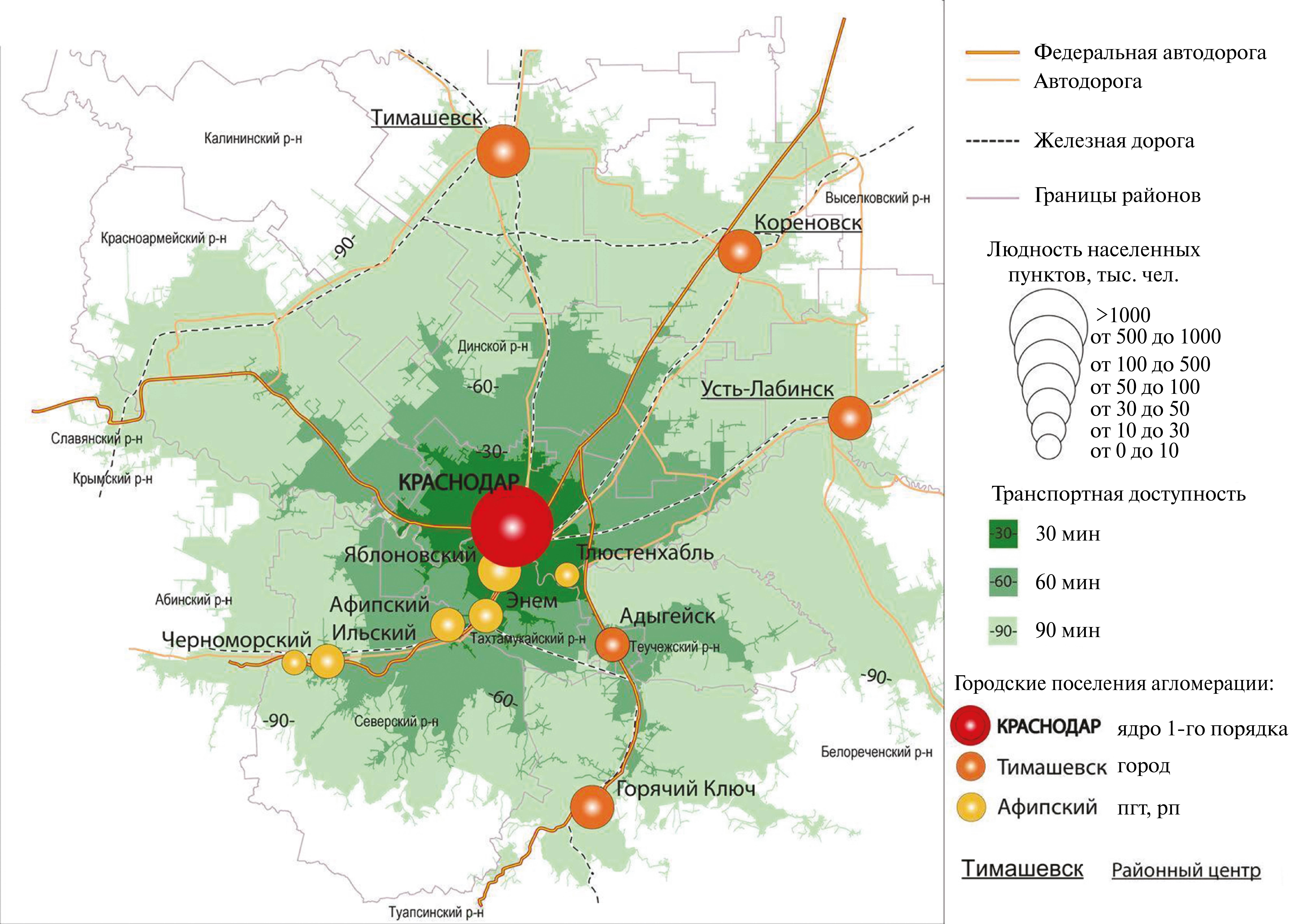 Рис. 5. Краснодарская агломерация: границы зон транспортной доступности и людность населенных пунктов. Источник: (Сопнев, Белозеров, 2023, с изменениями).