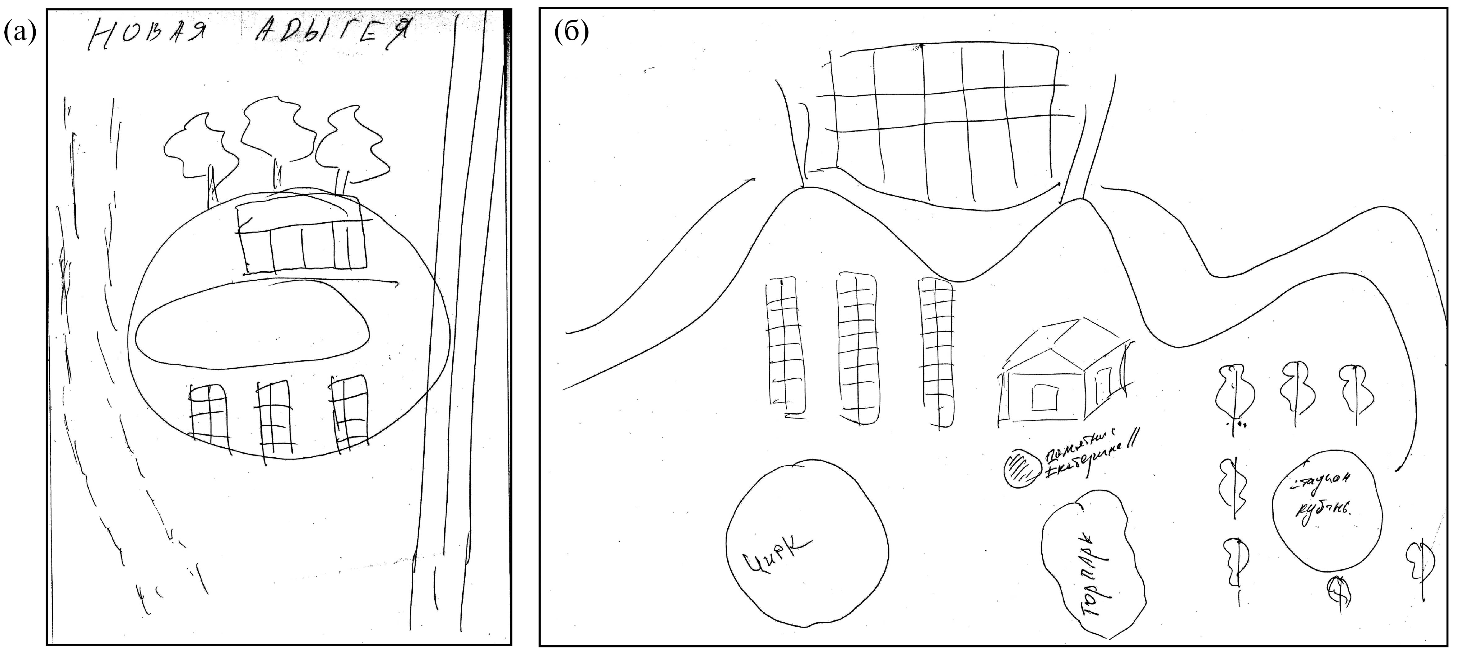 Еще ярче подсознательная инкапсуляция жизненного пространства проявилась в рисунках жителей поселков Новая Адыгея и Яблоновский, недавно переехавших в Краснодарский край из других регионов РФ (рис. 6). На вопрос модератора о значении круга на изображении Новой Адыгеи (см. рис. 6а) был получен весьма характерный ответ: “Ну, я представляю, что наш поселок какой-то круглый, что ли… ну, что он большой, но дорога из него узкая”. Ощущение пространственной обособленности было свойственно и новоселам со стажем: “... Так получилось, что я на Космической живу… в Яблоновском, там такой очень изолированный и самодостаточный... компактный район” (см. рис. 6б).