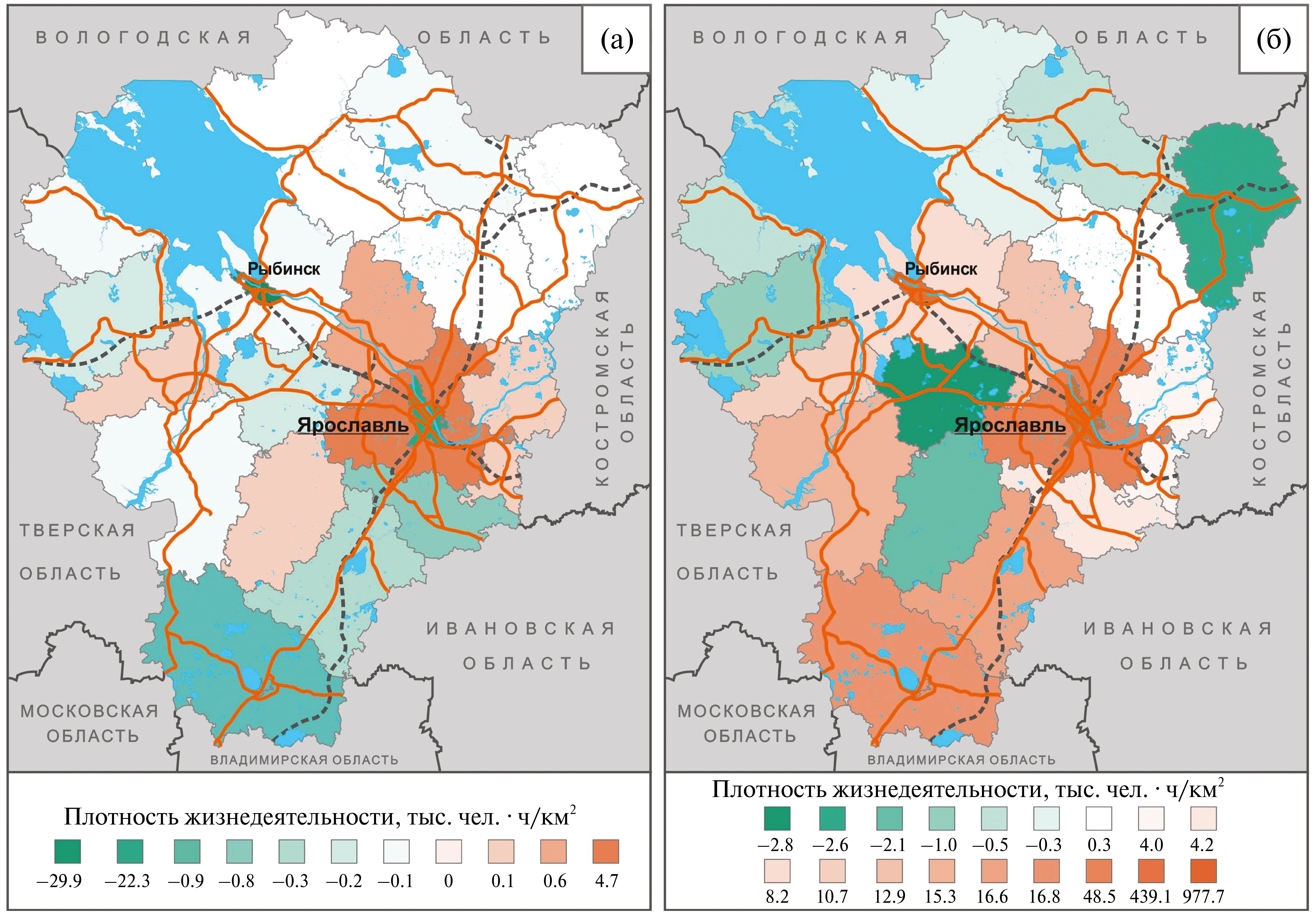 В Ярославской агломерации, как зоне основной социально-экономической активности, высокая плотность жизнедеятельности возникает в результате комбинации различных масштабных миграционных потоков. В качестве иллюстрации можно привести пример пригородного Ярославского района. Выгодное географическое положение и привлекательные условия для приобретения и аренды жилья сказываются на значениях сальдо всех переселенческих миграций (рис. 1а). Территория района характеризуется положительным миграционным балансом, что, вероятно, связано как с притоком новых жителей из региональной столицы (субурбанизации) и других районов области, так и с притоком межрегиональных и международных мигрантов. Кроме того, плотность жизнедеятельности повышается (рис. 1б) благодаря трудовой маятниковой миграции на крупные промышленные и сельскохозяйственные предприятия, туристическим потокам и дачной мобильности.