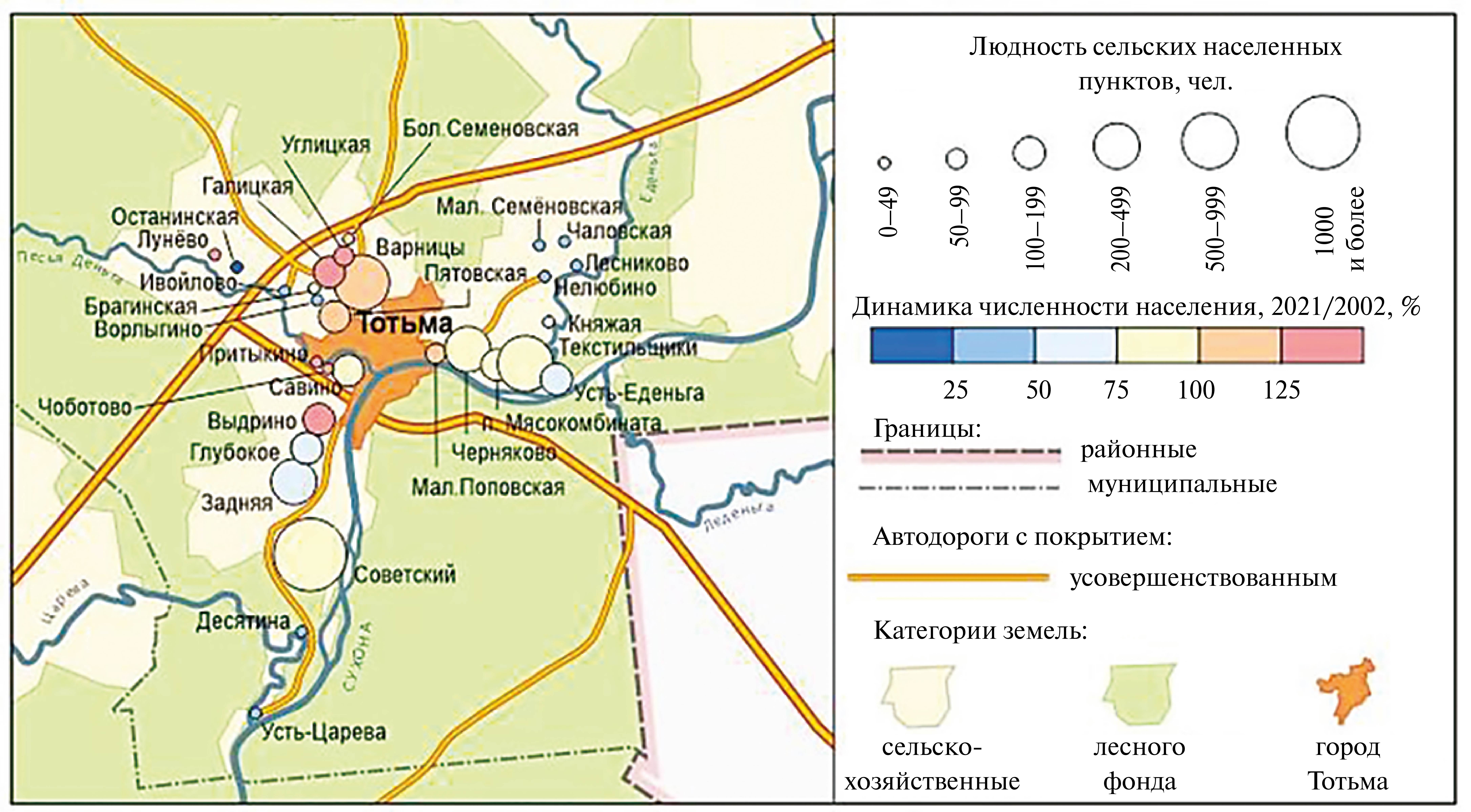 Динамика населения в населенных пунктах вокруг Тотьмы (рис. 1) обусловлена разнообразными факторами, в числе которых и параметризуемые, которые можно считать объективными, и непараметризуемые, которые в большей степени характеризуют качество места. К первым можно отнести размер (людность), который влияет на наличие и нередко качество социальной инфраструктуры и характер застройки (благоустроенные квартиры в многоквартирных домах популярны у новых жителей пригородных населенных пунктов), и расстояние до Тотьмы в сочетании с наличием асфальтированной дороги и, по возможности, с регулярным пригородным автобусным сообщением. Ко вторым – сочетание различных характеристик места, в числе которых могут быть как непосредственно расположение на берегу р. Сухоны, так и локальные аттракторы: живописные долины малых рек, соседство с примечательными объектами (элементы благоустройства, памятники истории или архитектуры и др.).