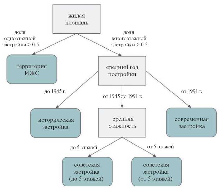 Для определения морфологических типов жилой застройки разработан алгоритм ветвления (рис. 1), который учитывает количество жилых зданий, их площадь, год постройки и этажность. Всего было выделено пять основных типов жилой застройки: 1) одноэтажная застройка (территории ИЖС); 2) историческая застройка (многоквартирные дома, построенные до 1945 г.); 3) послевоенная застройка до пяти этажей (застройка “хрущевского” типа – типовые многоквартирные дома 1955–1970-х годов постройки этажностью преимущественно ниже пяти этажей, самые массовые серии домов – 1-464, 1-447, 1-335) и 4) застройка выше 5 этажей (застройка “брежневского” типа – типовые многоквартирные здания 1970–1980-х годов постройки этажностью преимущественно выше пяти этажей, серии домов – II-49, П-43, 1ЛГ-602) и 5) современная (постсоветская) многоквартирная застройка (с 1992 г. постройки). Результатом работы алгоритма является автоматическое определение доминирующего типа застройки для каждого гексагона, с учетом того, что в его границах могут находиться здания разных морфотипов.