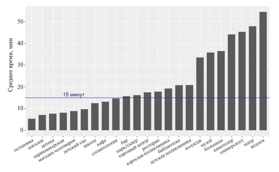 Рис. 2. Средняя по трем городам (Краснодару, Саратову и Набережным Челнам) пешеходная доступность до объектов каждого типа, включенного в индекс, мин. Составлено авторами.
