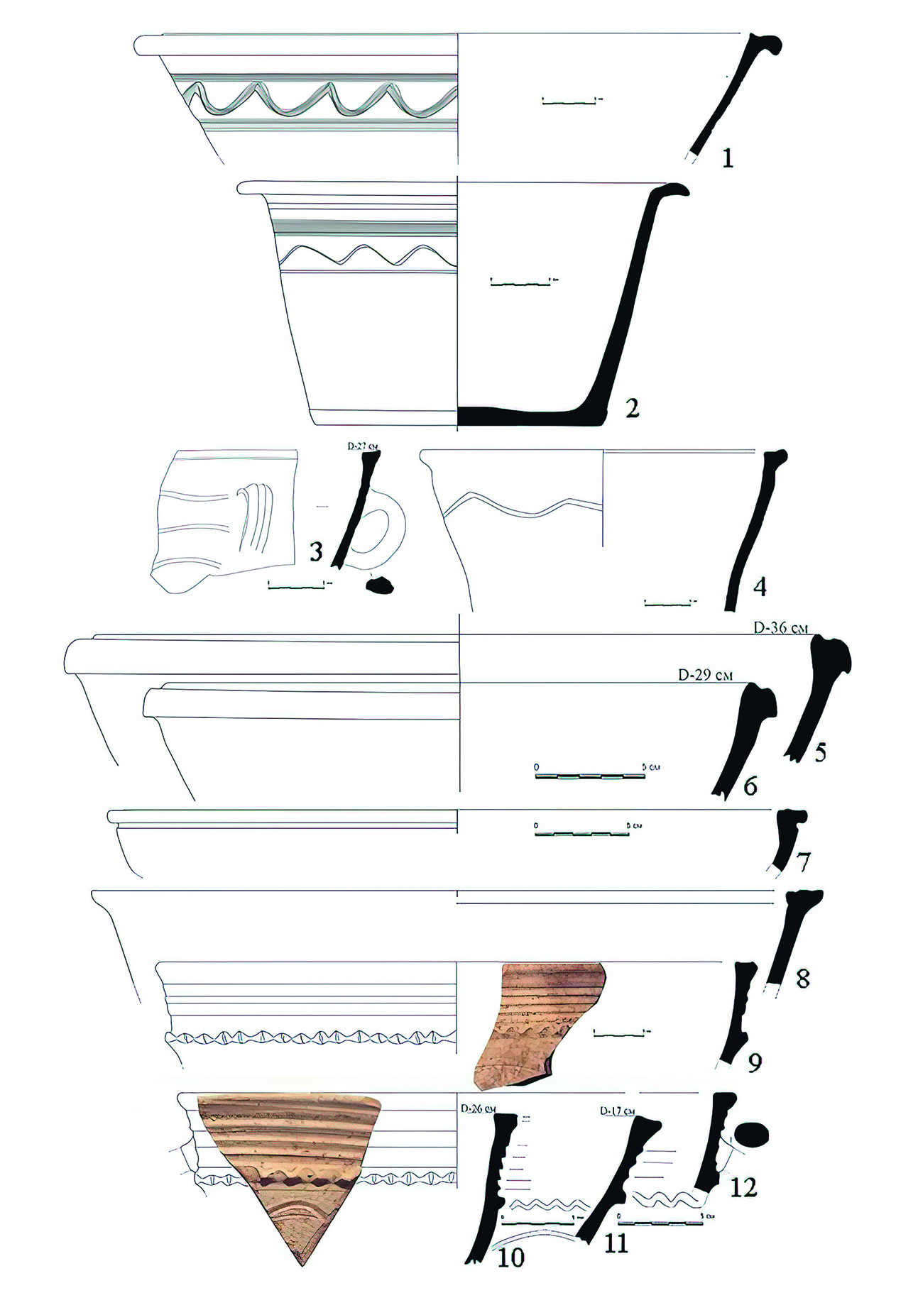 Ил. 2. 1–2 — большие хозяйственные сосуды с арочным бортиком формы II, по Дж. Магнесс; 3–4 — большие хозяйственные сосуды с арочным бортиком формы III, по Дж. Магнесс; 5–6 — большие хозяйственные сосуды с клювовидным бортиком; 7–8 — большие хозяйственные сосуды с двумя желобками на бортике; 9–12 — большие хозяйственные сосуды с желобчатой верхней частью тулова, отделённой от нижней поясом пальцевых вдавлений