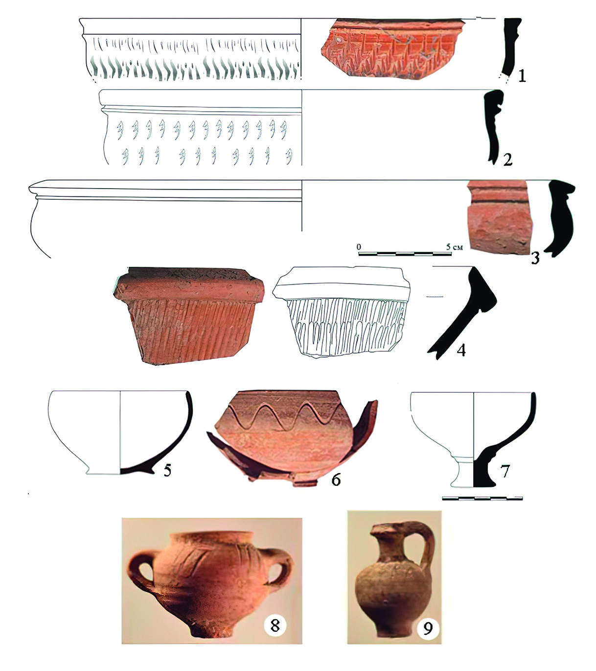 Ил. 4. 1–4 — чаши с рядами насечек, нанесённых зубчатым штампом (Rouletted Bowls); 5–9 — посуда группы «Столовой византийской посуды» (Fine Byzantine Ware)