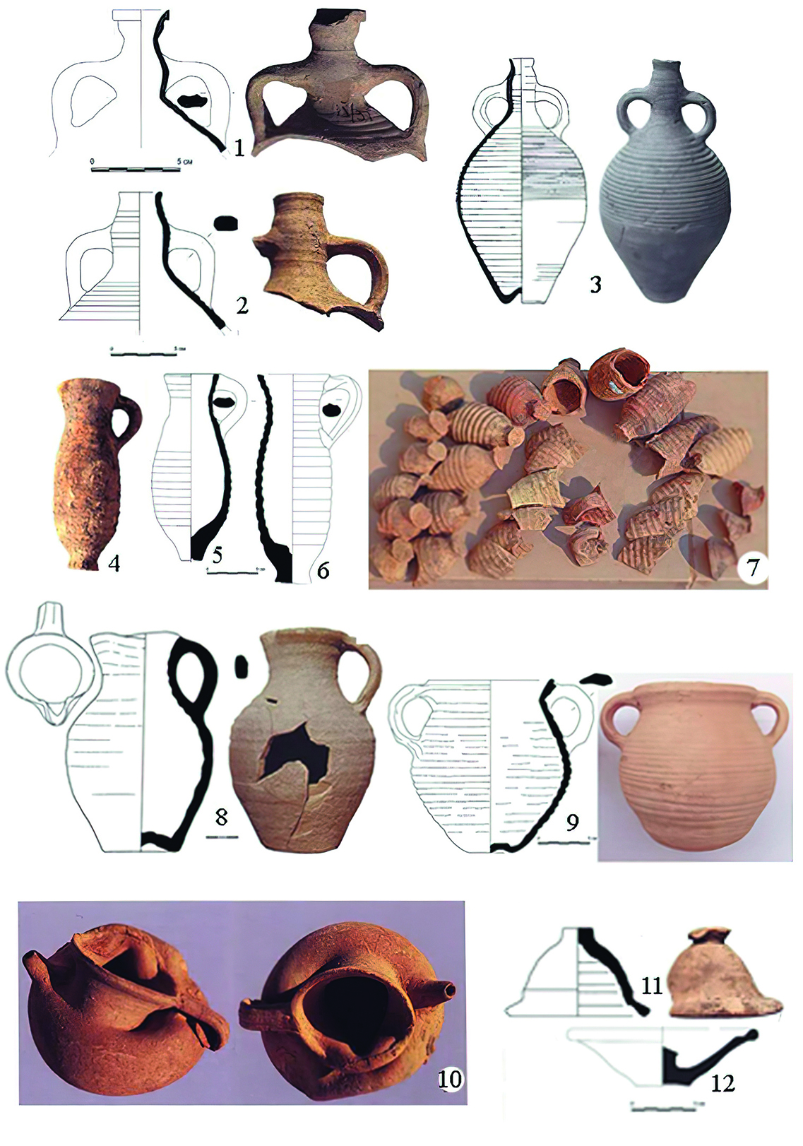 Значительно меньшим количеством представлены южно-палестинские амфоры V–VIII вв. (тип Арнон-811 [7, p. 32], выполненные из глины, цвет которой варьирует от оранжевого до оранжево-коричневого. Производились эти амфоры в Южной Палестине и были широко распространены в Палестине, Трансиордании, Сирии, Египте, Средиземноморье и Причерноморье. Использовались для транспортировки и хранения различных продуктов (сушёные фиги, рыбный соус и пшеница) и жидкостей (вино, вода, масло).
