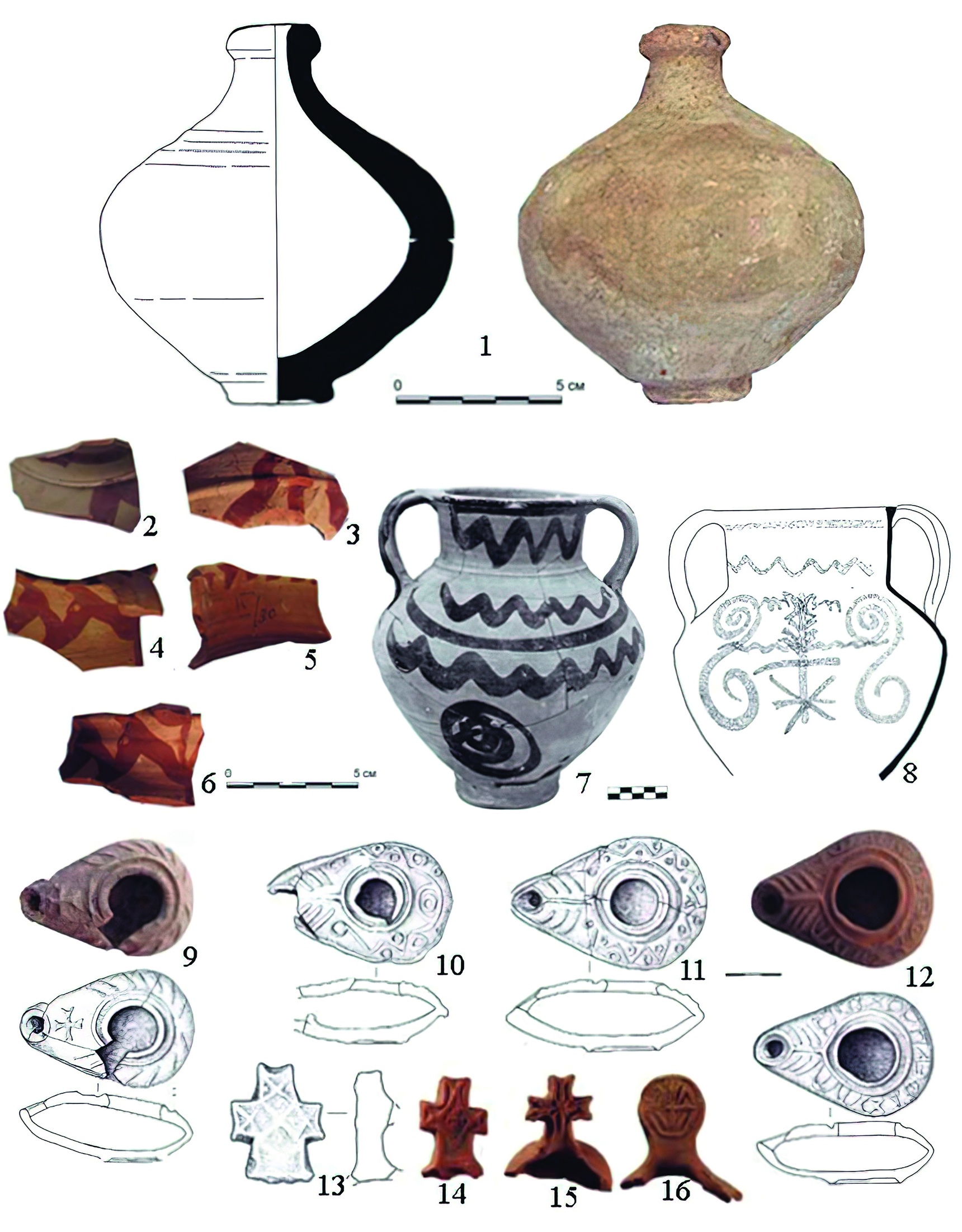 Остановимся на находках светильников с изображением подсвечника, чрезвычайно популярных в Палестине. Светильники имели биконическую форму, языкообразную ручку и большое отверстие для наливания масла (ил. 6, 10–11). Косые рельефные линии по обе стороны носика определяют либо как пальмовую ветвь, либо как менору; иногда вместо подсвечника на носике помещалось изображение креста (ил. 6, 9). Часто встречаются светильники с греческими надписями (самая распространённая: «ФWC XPICTOY ФENI ПACINI», т.е. «свет Христов просвещает всех») (ил. 6, 12). Встречаются светильники с поднимающейся над резервуаром ручкой в форме креста, овала или полуовала с рельефным орнаментом на верхней поверхности (ил. 6, 13–16). Предполагается наличие нескольких центров по их производству, в том числе Иерусалим и Хирбат ель-Ньяна [24, p. 67, fig. 8]; возможно, их производили и странствующие мастера. Бытовали такие светильники со второй половины IV до конца VII / начала VIII в. [16, p. 251–255; 24, p. 65].