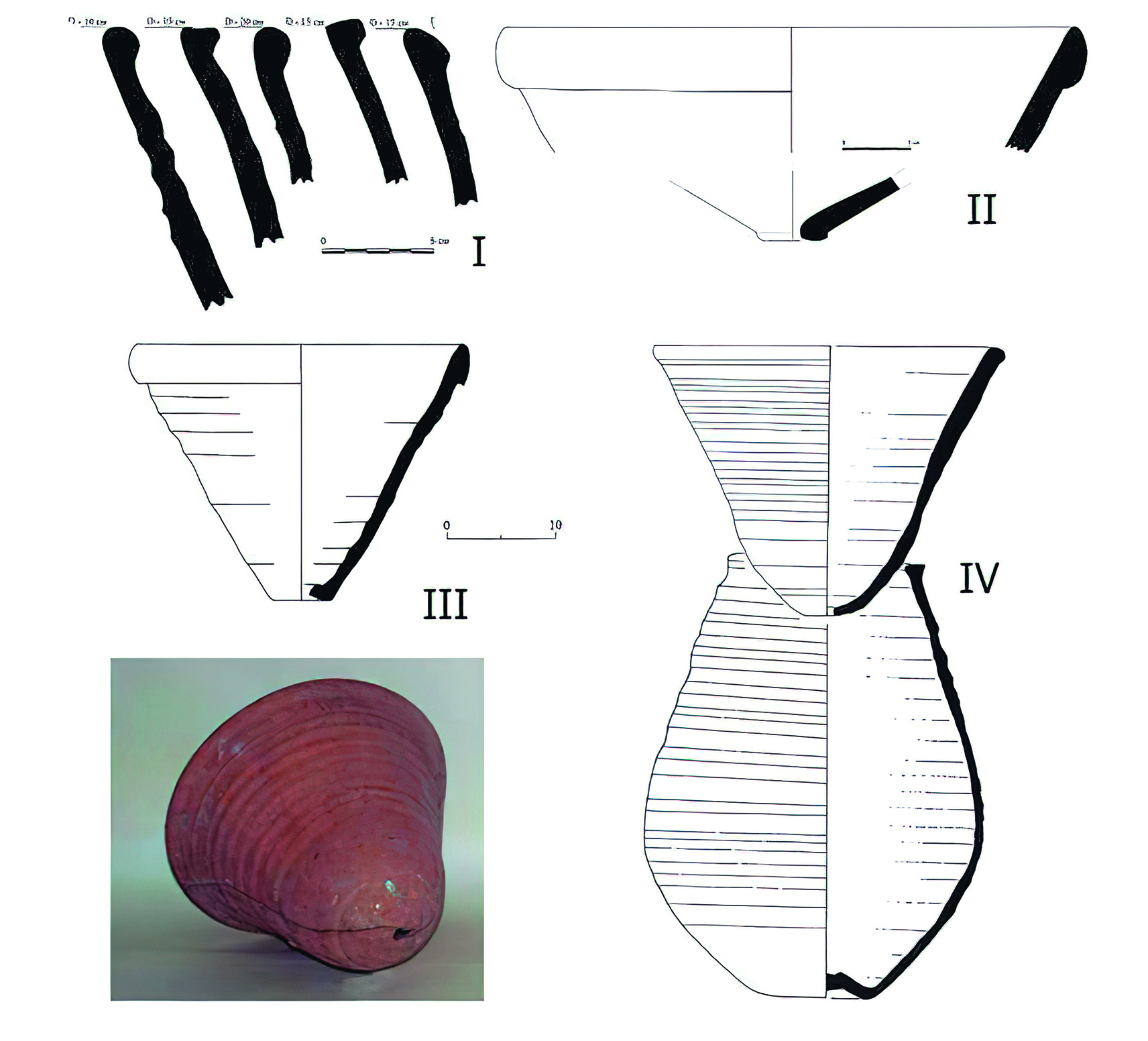 Только византийским временем датируются чаши с рядами насечек, нанесённых зубчатым штампом, на внешней стороне бортика, так называемые Rouletted Bowls [16, p. 185–188] (ил. 4, 1–4). Производились такие сосуды в нескольких центрах, в том числе в Иерусалиме и Хорбат Цефее. Датируются концом III – началом IV–V в. (форма 1) и VI (форма 2) [16, p. 186–188].