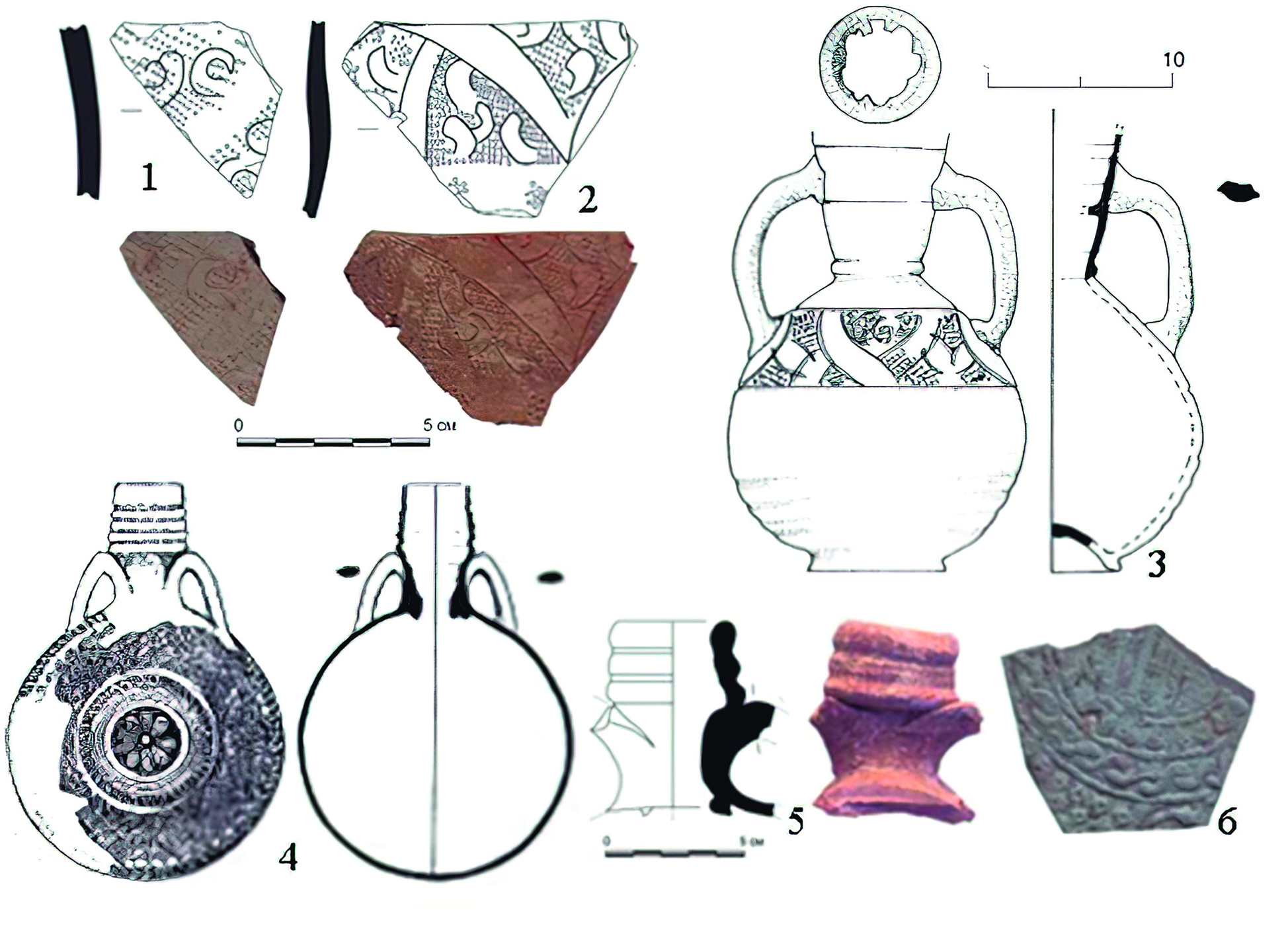 Несколькими фрагментами представлены светлоглиняные кувшины и фляги со штампованным орнаментом XIII–XIV вв. (ил. 8, 1–6). Производились такие сосуды в разных центрах сиро-палестинского региона, в том числе Иерусалиме и Дамаске, и были распространены на территории Сирии, Палестины и Трансиордании [18, p. 171–173].